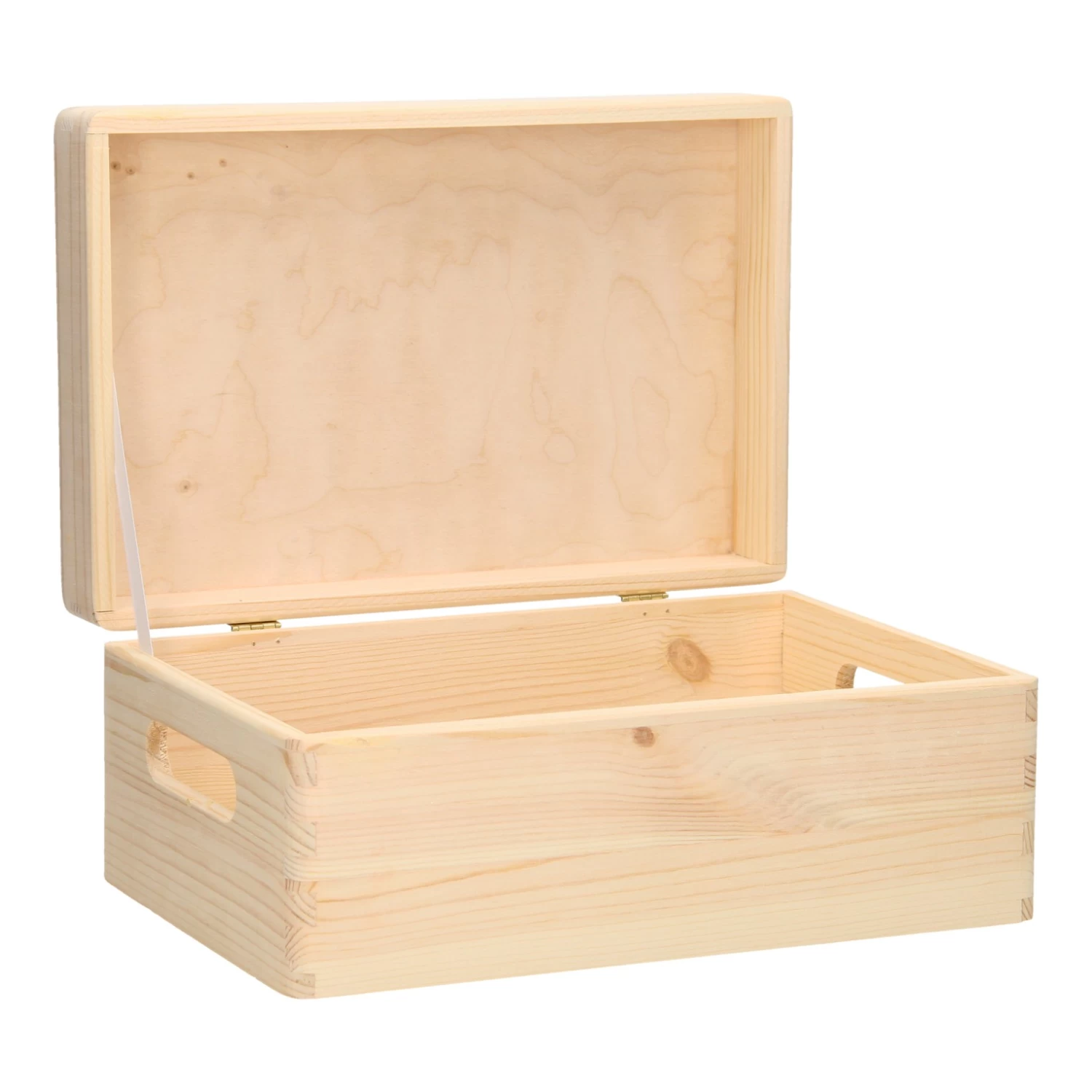 Schöne rechteckige Aufbewahrungsbox aus Kiefernholz mit Klappdeckel. Die Ecken sind abgerundet. Der Klappdeckel ist mit einem Band versehen, sodass er nach dem Öffnen aufrecht bleibt. Die Scharniere haben eine goldene Farbe. Dank der Griffmulden an der Seite lässt sich die Box leicht bewegen. Dekorieren Sie die Aufbewahrungsbox ganz nach Ihren Wünschen. Maße Innenkarton: 28 x 18 Zentimeter.