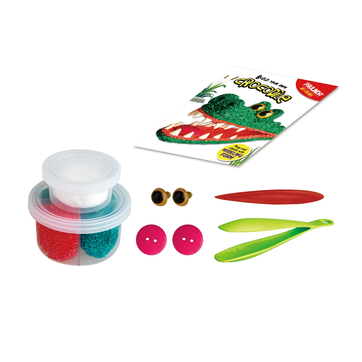 Basteln Sie mit diesem Bastelset aus Schaumstoff Ihr eigenes Krokodil. Kneten Sie das Tier mit der grünen Klammer, damit das Krokodil seine Form erhält. Zum Schluss kleben Sie die Augen auf seinen Kopf und die Zähne in seinen Mund. Lassen Sie es eine Weile trocknen und fertig ist Ihr selbstgemachtes Krokodil. Pass auf, dass er dich nicht beißt! Geeignet ab 5 Jahren.