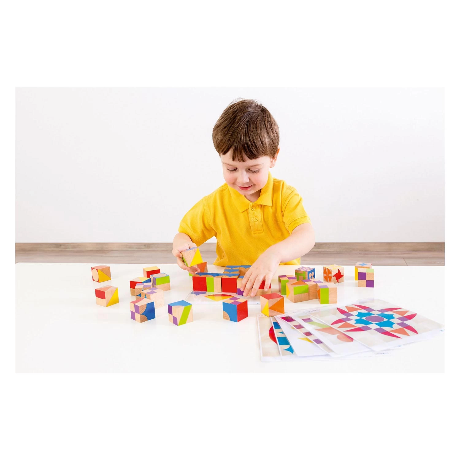 Holzklötze mit farbigen Mustern zum Erstellen und Formen unzähliger Mosaike! Legen Sie damit Figuren oder erstellen Sie Strukturen, horizontal oder vertikal: Lassen Sie Ihrer Kreativität freien Lauf. Die Box enthält 41 Holzklötze.