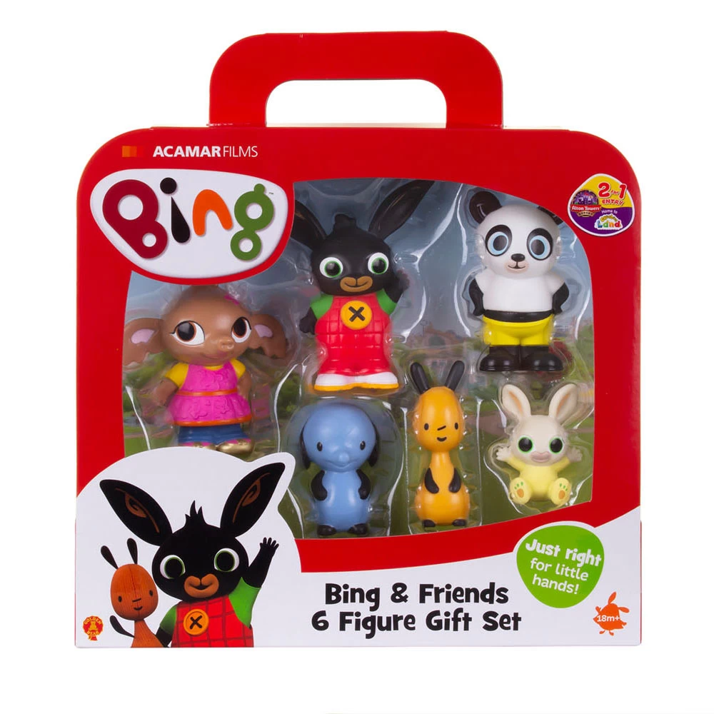 In diesem roten Koffer sind alle Figuren der Serie enthalten. Jetzt können Sie alle Abenteuer endlos spielen! Dank des praktischen Griffs am Koffer können Sie Bing, Flop, Sula, Pando, Charlie und Amma überall hin mitnehmen. Die Figuren haben eine Höhe von 5 bis 9 Zentimetern.