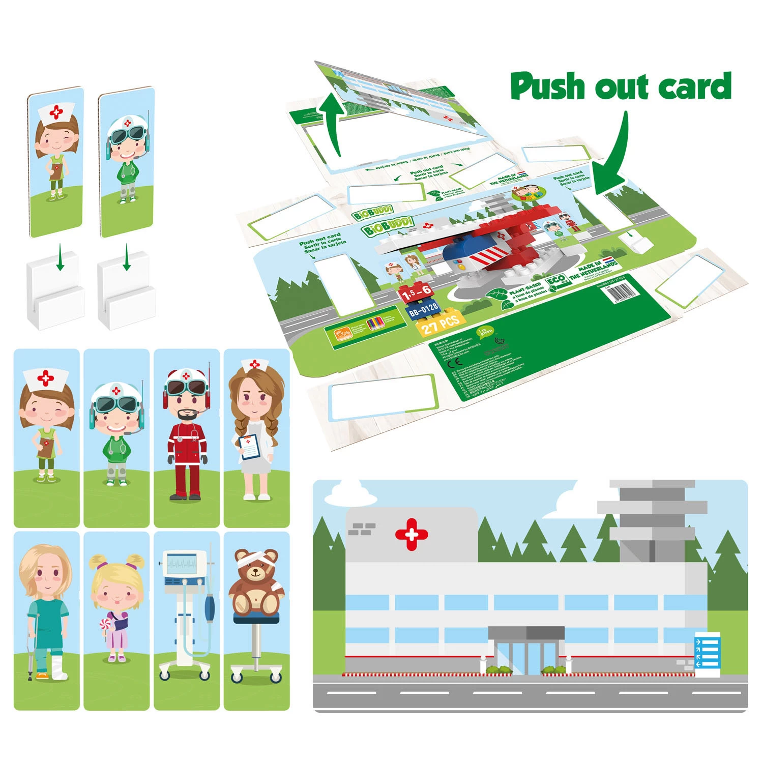 Steuern Sie Ihren eigenen Rettungshubschrauber! Fliegen Sie hoch in die Luft, meiden Sie Bäume und fliegen Sie knapp über der Wasserschicht. Zeigen Sie Ihr fliegerisches Talent mit dem RESCUE-Helikopter! „Bürgermeister! Hilfe, ich stecke in den Bergen fest!“ Bauen Sie schnell den RESCUE-Hubschrauber, fliegen Sie hoch in die Berge und suchen Sie nach dem verängstigten Bürger. Können Sie ihn finden? Das Rescue-Spielset besteht aus 40 verschiedenen Teilen, hergestellt aus Resten der Zuckerrohrpflanze. Die Blöcke sind umweltfreundlich, recycelbar, nachhaltig und auch mit anderen Marken austauschbar. Die Verpackung ist so gestaltet, dass sie Teil des Produkts ist. Es ist aus FSC-Karton gefertigt und mit einem einfachen „Push“-Knopf versehen. Für noch mehr Spielspaß können Sie verschiedene Karten ganz einfach entnehmen und in die mitgelieferten Kartenhalter legen. BiOBUDDi wurde für Kinder zwischen 1,5 und 6 Jahren entwickelt. Es hilft Kindern, beim Spielen und Bauen mit BiOBUDDi motorische, kognitive und kreative Fähigkeiten zu entwickeln.