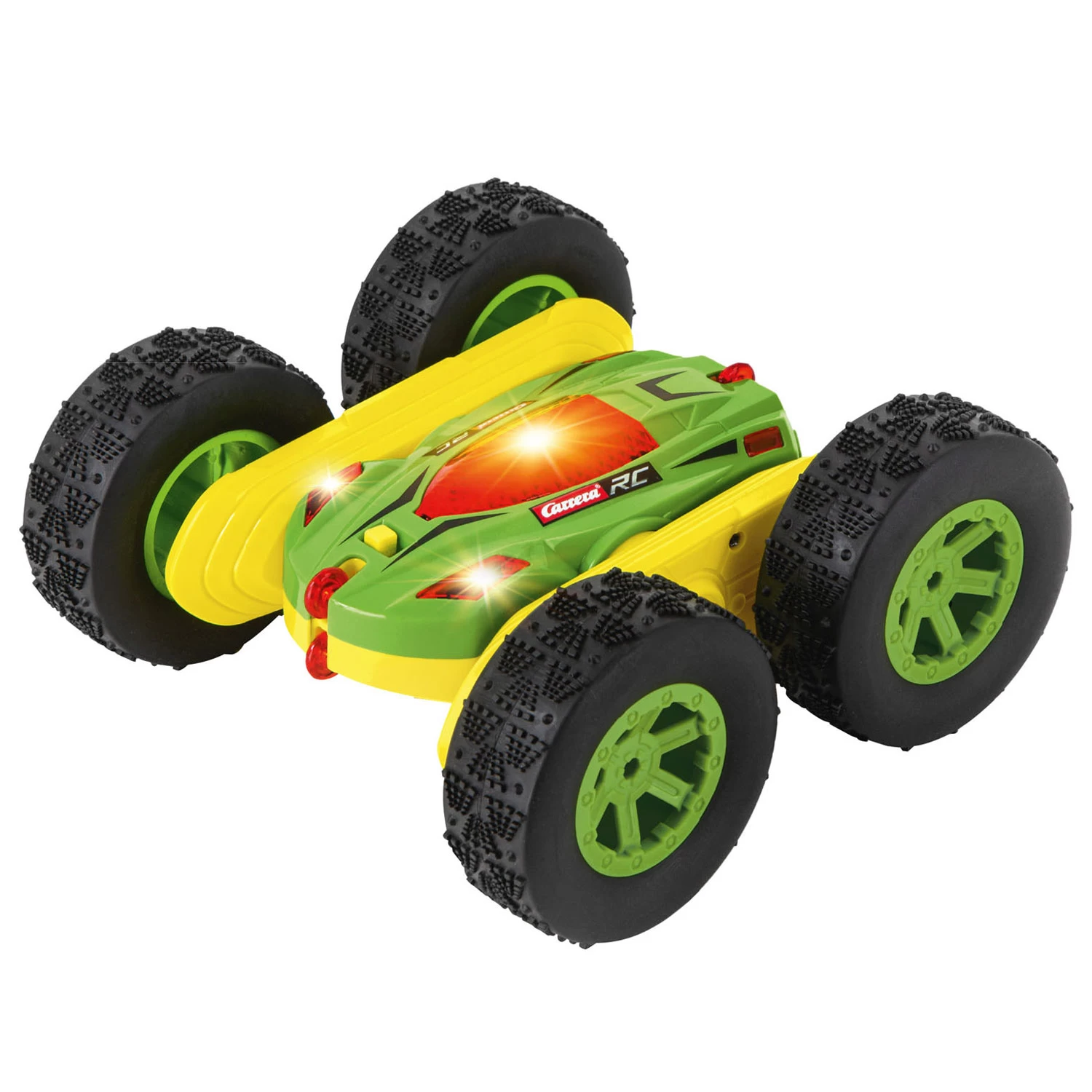 Dieser Carrera RC – Mini Turnator 2.0 ist fahrbereit! Der Mini Turnator ist dank der coolen 360-Grad-Flipover-Funktion ein echtes Stuntauto. Die LED-Beleuchtung macht es komplett! Das steuerbare Auto wird mit einem wiederaufladbaren Akku, einem 0,5 A USB-Ladekabel und 2 AAA-Batterien geliefert. Die Fahrzeit beträgt 15 Minuten. Die Ladezeit beträgt 60 Minuten.