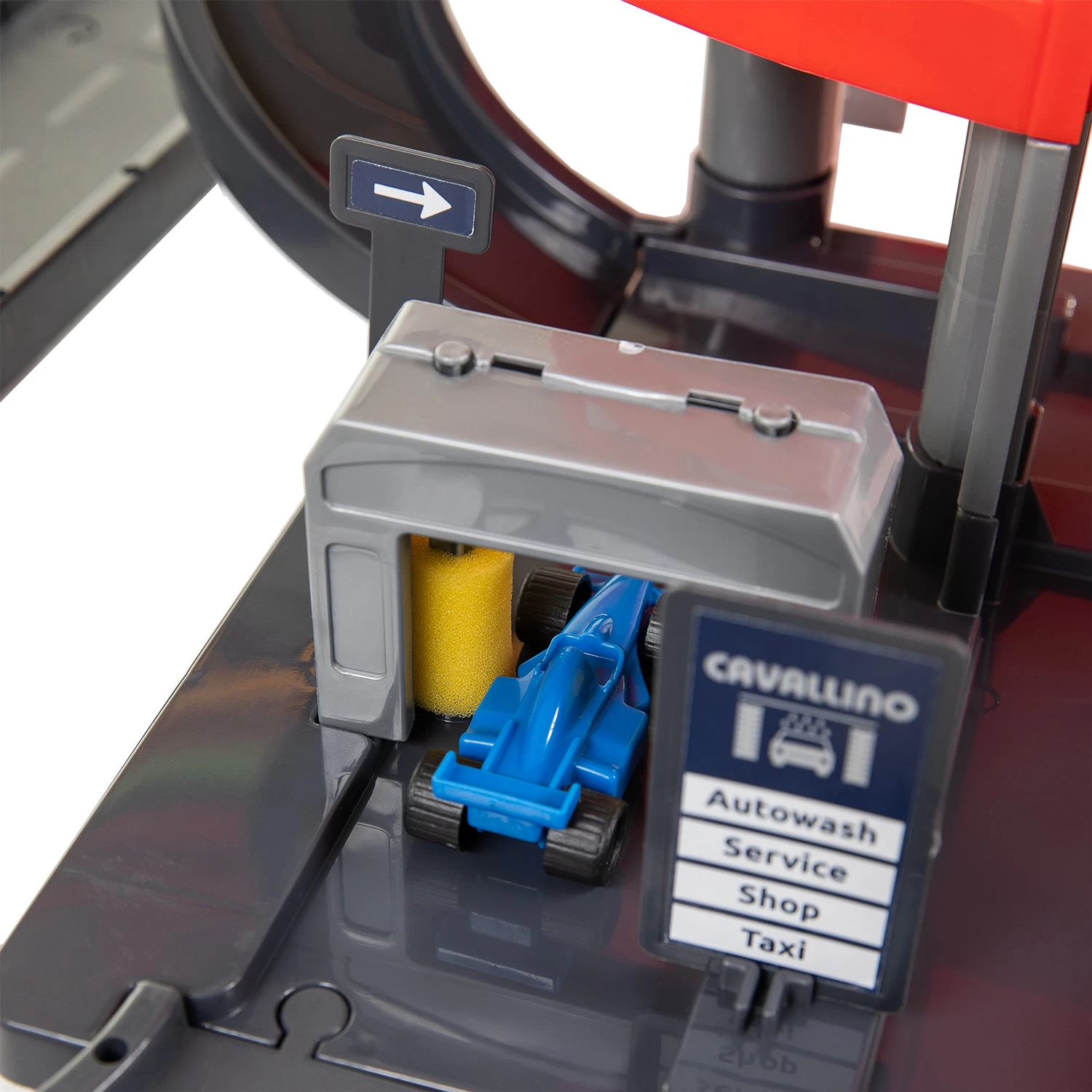 Das Cavallino-Rennparkhaus mit 4 Etagen und 4 Rennwagen ist für den echten Rennsportbegeisterten gemacht. Die Garage verfügt über vier Etagen, eine Autowaschanlage, eine Zapfsäule und eine Reparaturstelle. Rase über die Rennstrecke in der Garage und aus ihr heraus und erlebe stundenlangen Rennspaß! Ausstattung • Garage mit 4 Etagen • Mit Tankstelle, Autobrücke, Autowaschanlage und Aufzug • Inklusive 4 Rennwagen (Länge 9 Zentimeter) • Maße: 48,5 x 39 x 39 Zentimeter • Geeignet für Kinder ab 3 Jahren.