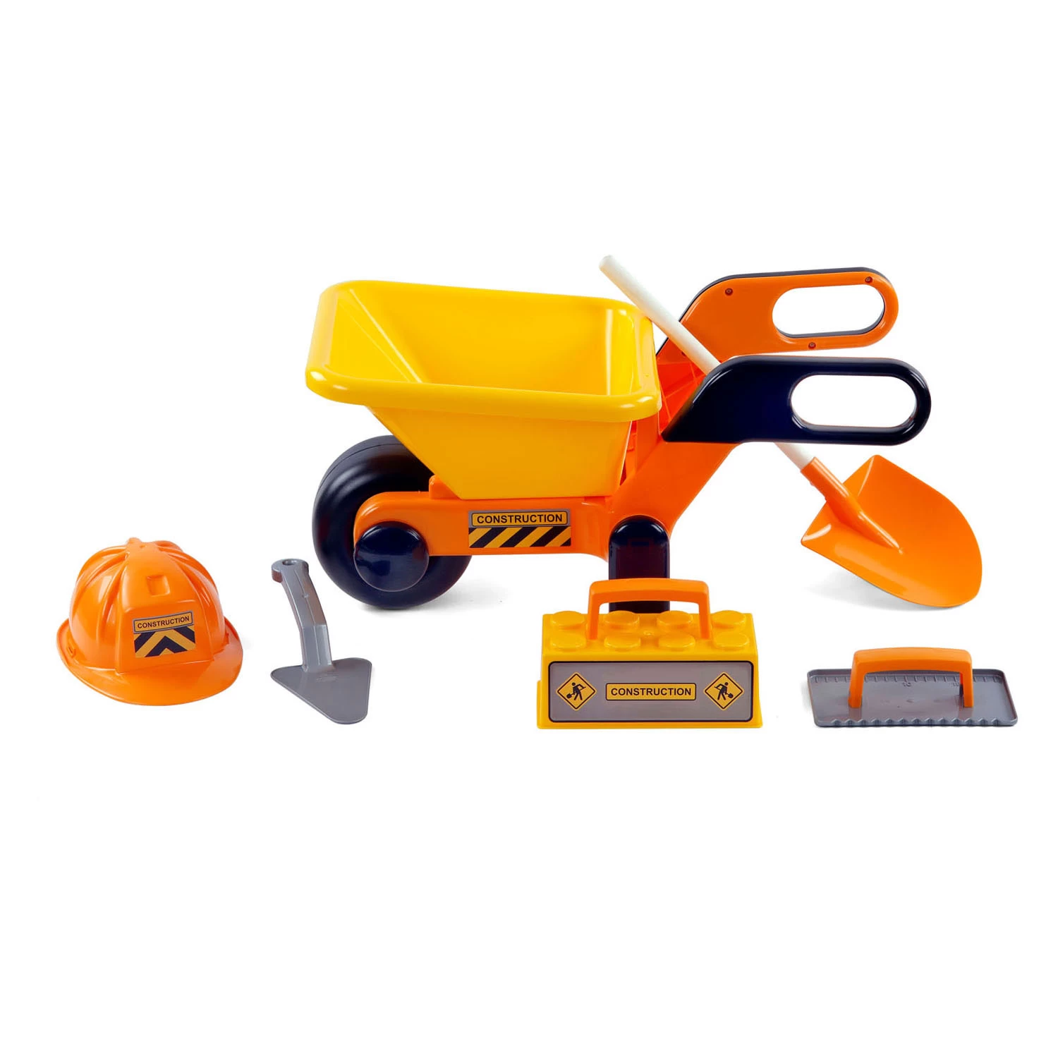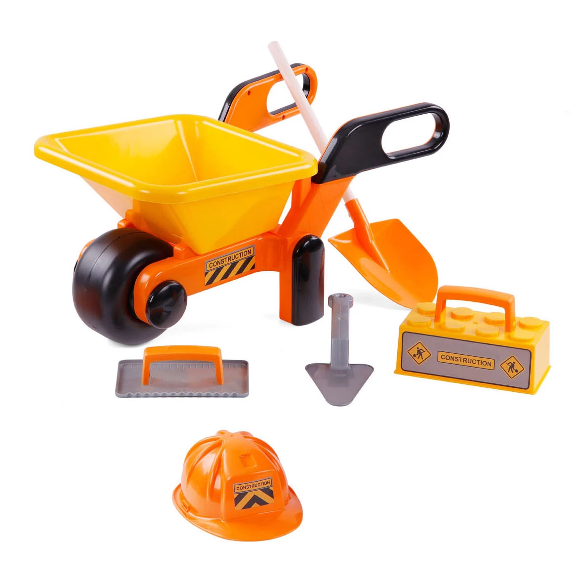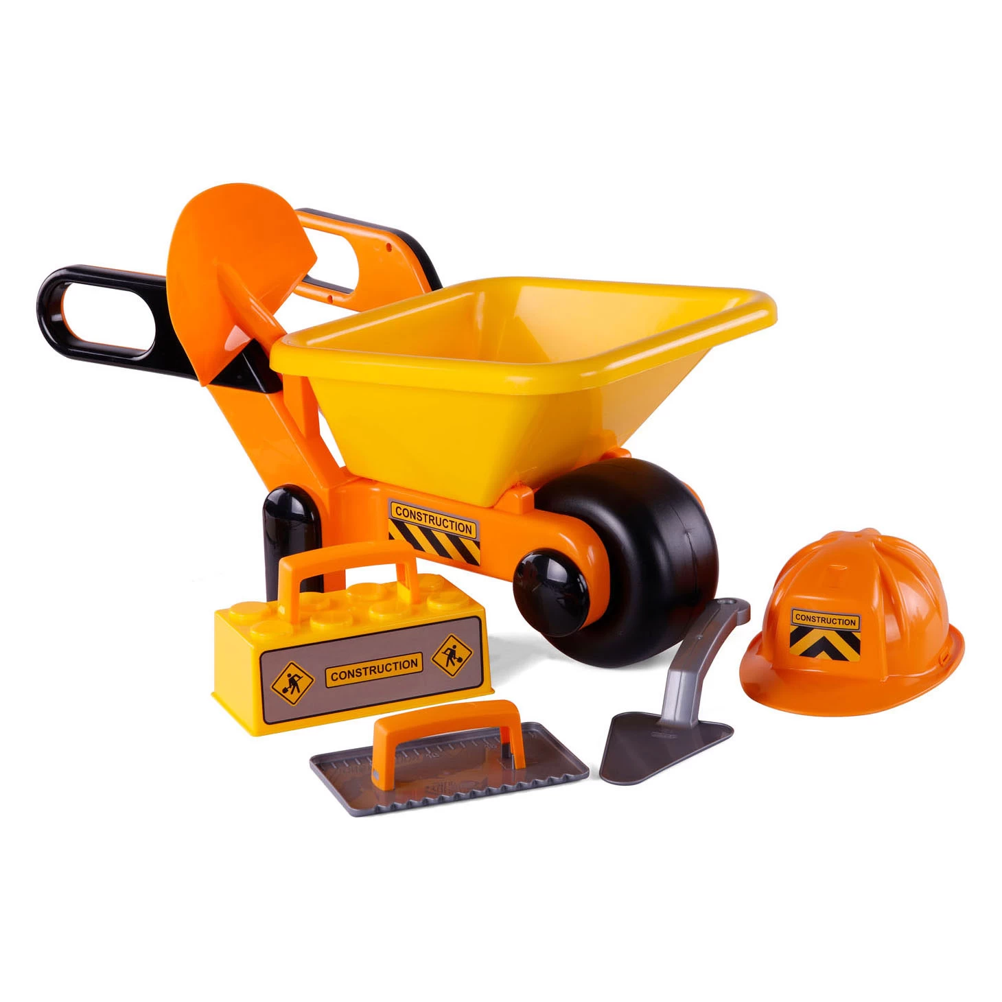 Sie können diese coole Schubkarre mit Sachen füllen. Die gelb, orange, schwarz gefärbte Schubkarre hat ein breites Rad, damit sie nicht so leicht umkippt. Die 2 Beine sorgen dafür, dass es stabil bleibt, während Sie es voll beladen. Sie können ihn mit den großen Griffen schieben. Das Set enthält außerdem Zubehör: einen Helm, eine Schaufel, ein Bauradio und 2 Maurerwerkzeuge. Damit kann man wirklich stundenlang spielen! Details • Abmessungen: 63,5 x 34,5 x 32 cm. • Material: Kunststoff. • Geeignet für Kinder ab 1 Jahr.