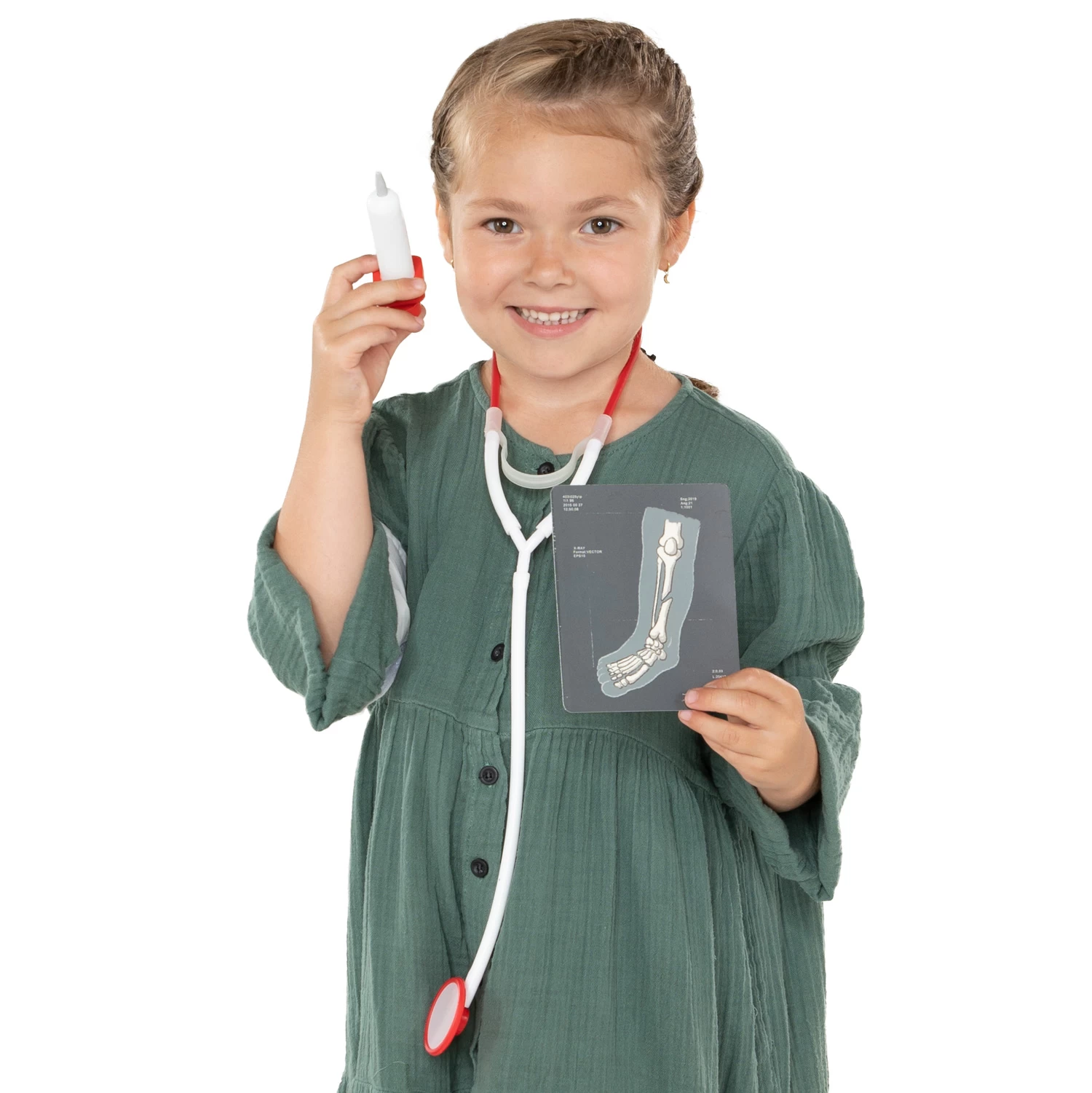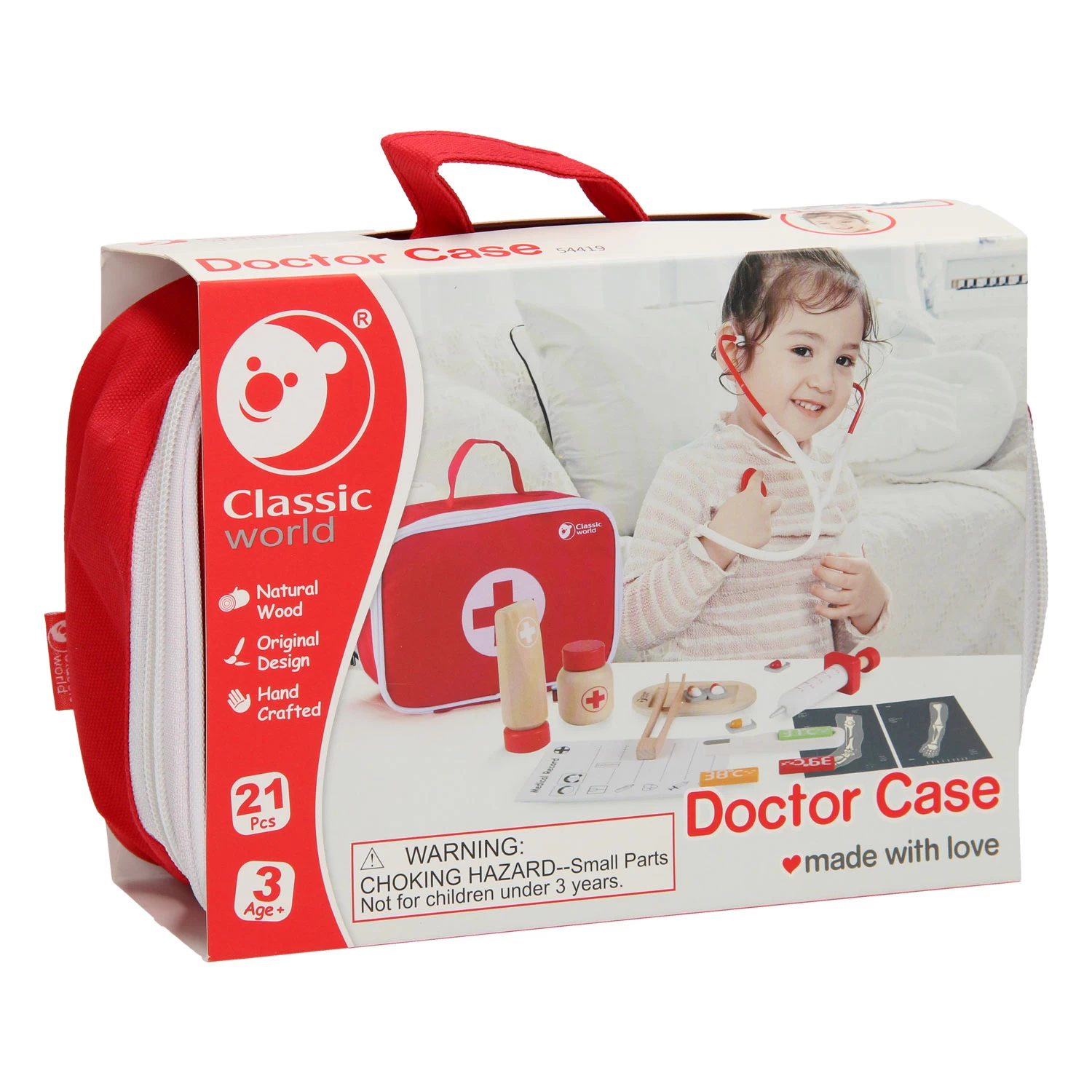 Seien Sie ein echter Arzt mit diesem hölzernen Arztset von Classic World. Das Set besteht aus einem Stethoskop, einer Spritze, einer Pinzette, einem Medikamentenbehälter mit Medikamenten, einem Thermometer, einer Salbentube, Röntgenbildern, einem roten Kreuzband und Arztpapieren. Damit können Sie alle Patienten im Handumdrehen gesund machen! Nach der Beratung können Sie die Artikel ganz einfach wieder in die Tasche stecken, bereit für den nächsten Patienten! Geeignet für Kinder ab 3 Jahren.