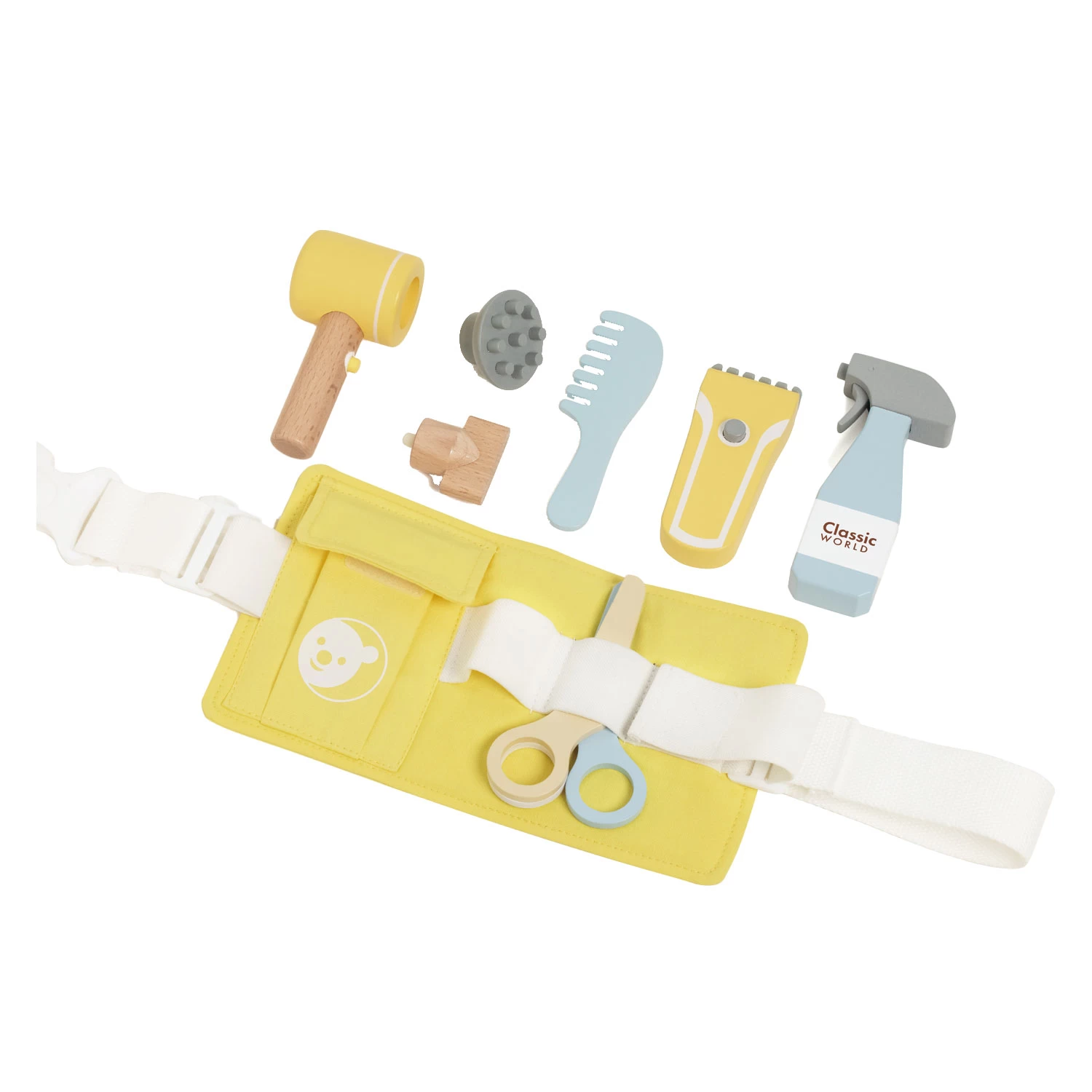 Ein moderner Friseurgürtel in frischen Farben; fröhliches Gelb und Pastellblau. Der Gürtel verfügt über einen Schnallenverschluss zum Befestigen der Taille und ist zudem am Gürtel in der Breite verstellbar.