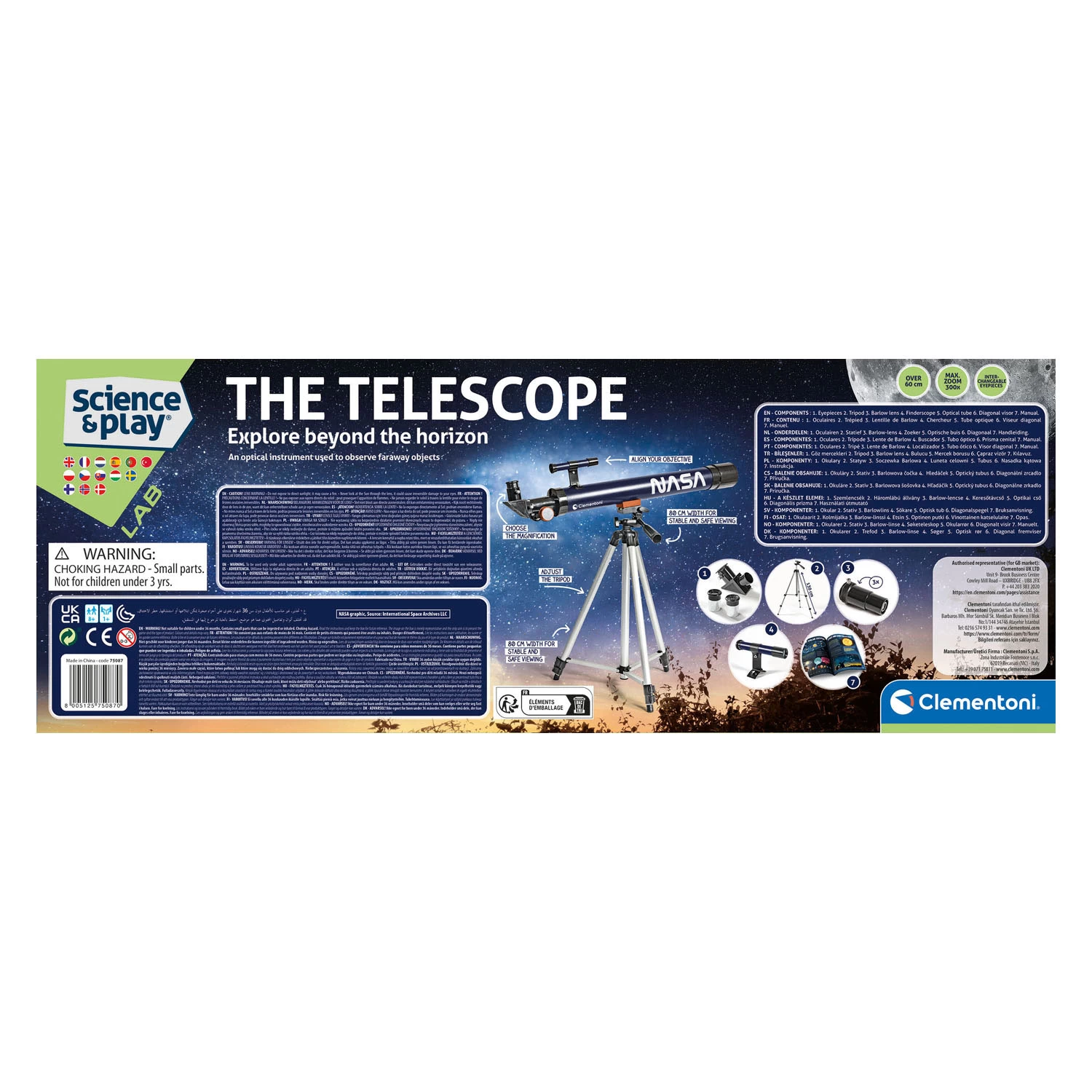 Erkunden Sie den Weltraum mit dem Science & Play Lab Telescope von Clementoni! Mit 300-fachem Zoom und austauschbaren Okularen können Sie den Mond, die Sterne und den wunderschönen Nachthimmel wie ein echter Forscher beobachten. Ein tolles Geschenk für Kinder, die von Raumfahrt, Planeten und Sternen fasziniert sind! Das Teleskop für Kinder enthält eine bebilderte Anleitung, die astronomische Grundlagen verständlich macht. Mit unzähligen unterhaltsamen und lehrreichen Aktivitäten zum Entdecken von Planeten und Sternbildern. Produktmerkmale • Teleskop für Kinder • Größe >60 cm • Ausziehbares Stativ (bis 130 cm) • 50-mm-Objektiv und 300-facher Zoom • Auswechselbare Okulare • Geeignet ab 8 Jahren