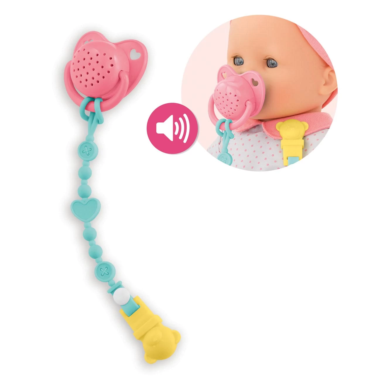Dieser interaktive Schnuller für die Poupon-Babypuppen von Corolle (36 cm). Der Schnuller enthält 15 verschiedene Geräusche. Stecken Sie den Schnuller in den Mund Ihrer Puppe und drücken Sie darauf. Dadurch sieht es so aus, als würde Ihre Puppe diese Geräusche machen. Geeignet für Kinder ab 3 Jahren. Betrieb mit 3 LR41-Batterien (im Lieferumfang enthalten).