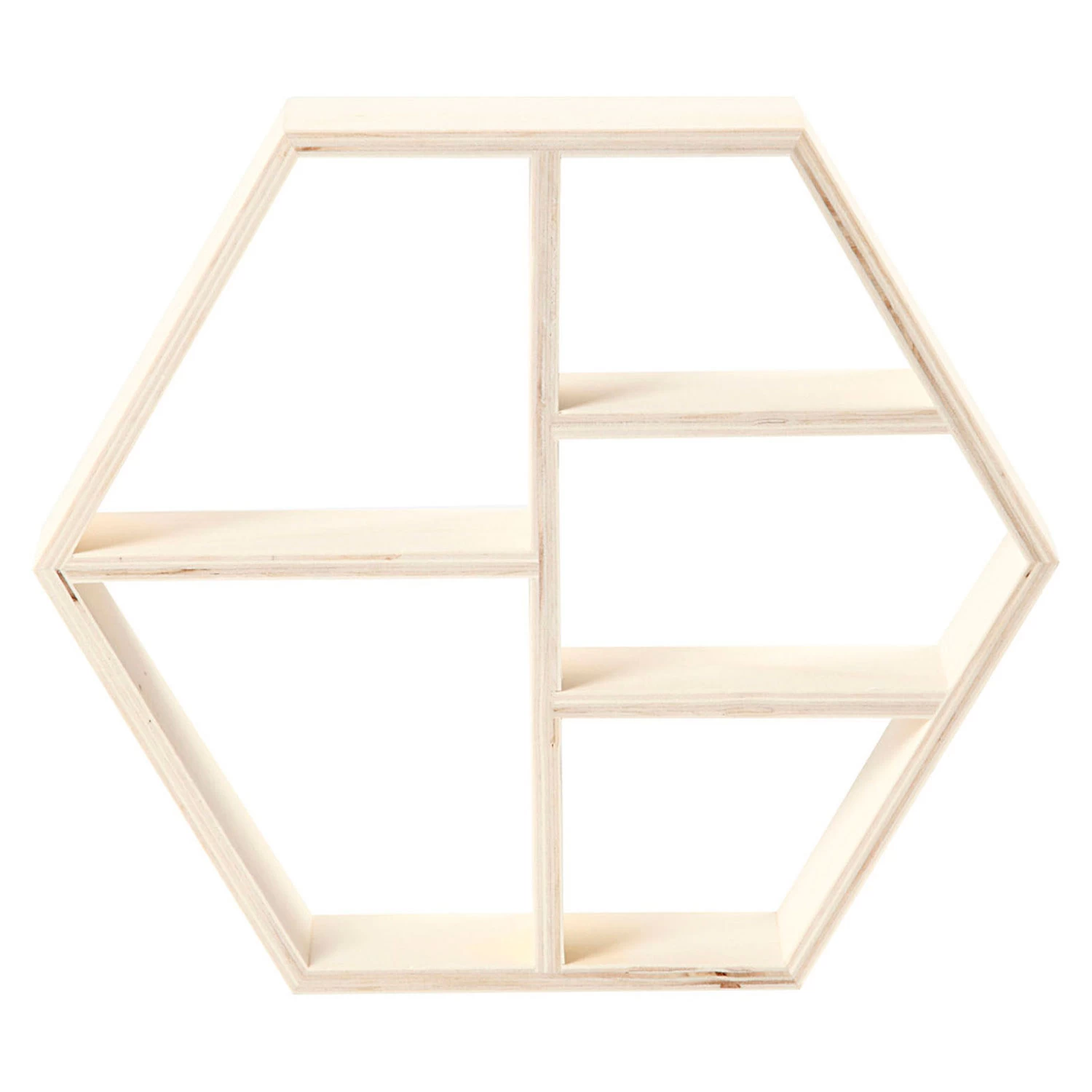 Dieses Display aus hellem Holz hat eine sechseckige Form. Sie können das Display bemalen und/oder dekorieren oder es so verwenden, wie es ist. Hängen Sie es an die Wand und füllen Sie die 5 Fächer mit schönen Accessoires. Zwei Fächer sind 11 Zentimeter hoch und drei Fächer sind 7 Zentimeter hoch. Die Gesamtmaße des Displays betragen 25 (H) x 28,5 (B) x 5 (T) Zentimeter.