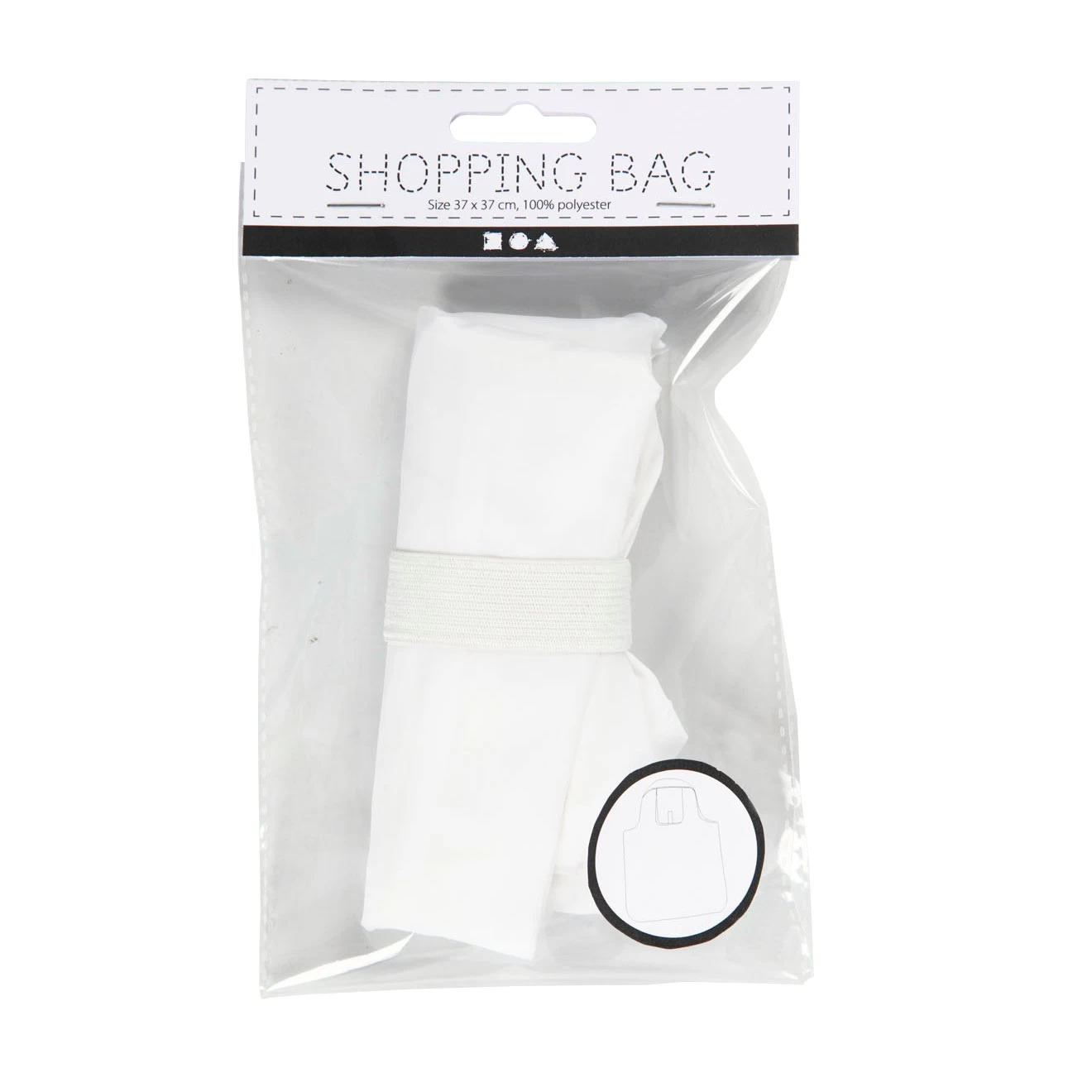 Praktische faltbare weiße Einkaufstasche aus 100 % Polyester. Geeignet zur Dekoration mit Textilmarker, Textilfarbe oder Stempeln. Waschen Sie die Tasche unbedingt, bevor Sie sie dekorieren. Bitte beachten Sie: Polyester ist ein nicht saugfähiges Material. Die Tasche kann maximal 6 Kilogramm tragen und hat die Maße 37 mal 37 Zentimeter.