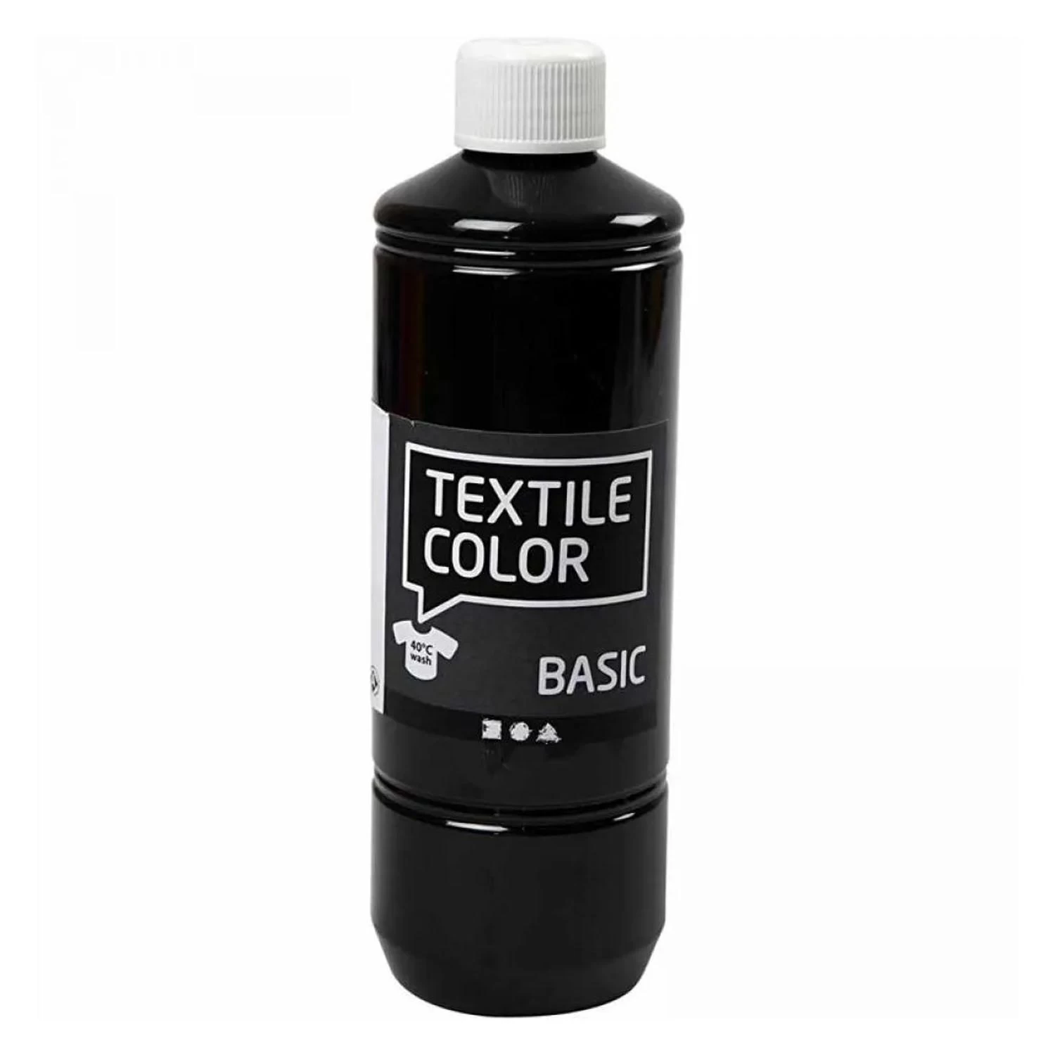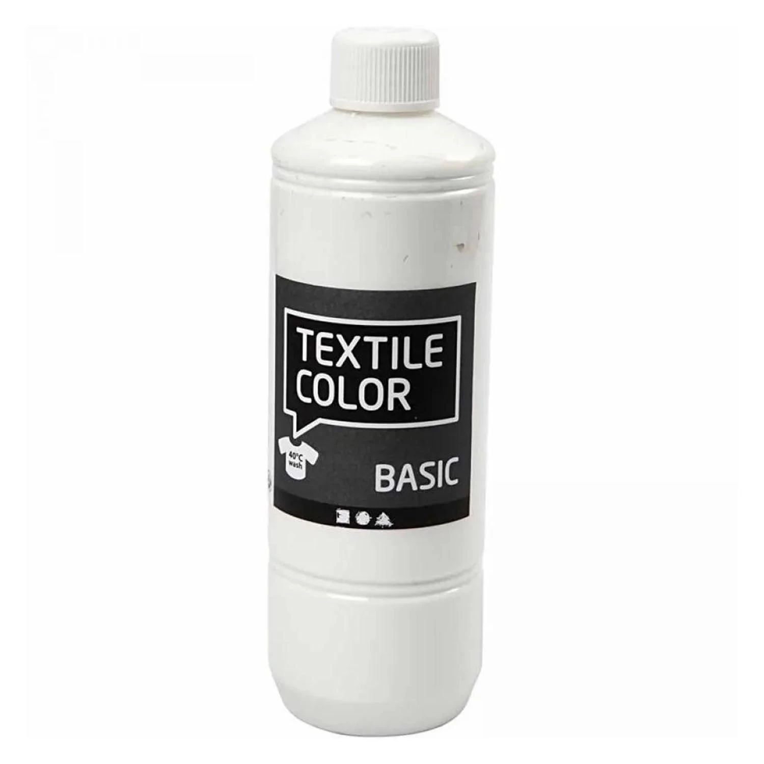Set mit 5 Flaschen Textilfarbe mit Primärfarben. Die Textilfarbe ist wasserbasiert und langlebig im Gebrauch. Das Set enthält drei Grundfarben: Gelb, Rot und Blau sowie eine zusätzliche Flasche Schwarz und eine Flasche weiße Textilfarbe.