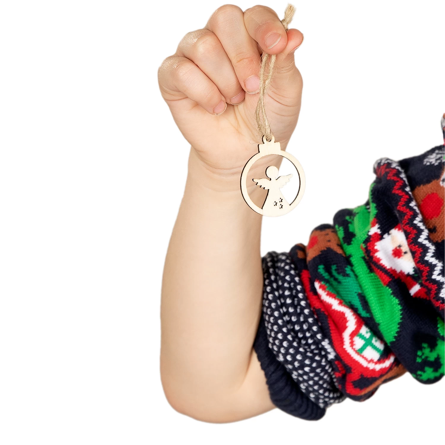 Set mit 24 eleganten, kleinen Dekorationen aus hellem Holz mit dunklen Kanten und Jutekordel. Diese kleinen Holzdekorationen haben ein leichtes, natürliches Aussehen und können problemlos mit jeder gewünschten Farbpalette und Technik dekoriert werden