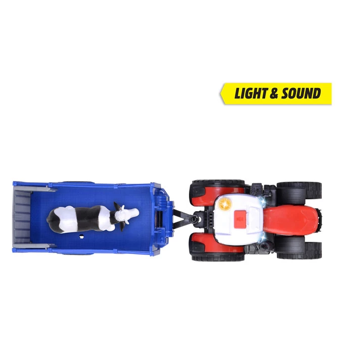 Dieses 26 cm große Set aus Traktor und Anhänger von Massey Ferguson ist das ultimative Spielzeug für angehende Junglandwirte. Der Anhänger ist speziell für den Transport von Tieren konzipiert und verfügt am Heck über eine kleine Klapprampe zum Be- und Entladen. Offiziell lizenziertes Massey Ferguson-Fahrzeug. Der Traktor ist offiziell von Massey Ferguson lizenziert und basiert auf dem Originalfahrzeug. Es verfügt außerdem über drehbare Räder für einfaches Manövrieren sowie realistische Licht- und Soundeffekte – perfekt für Rollenspiele mit Bauernhof-Thema! Spielzeugtraktor mit Zubehör Im Set ist außerdem eine schwarz-weiße Kuhfigur enthalten, die auf dem Tieranhänger transportiert werden kann. Es ist für Kinder ab 3 Jahren konzipiert, wird mit 2 x 1,5 V AAA-Batterien geliefert und ist eine tolle Ergänzung für jede Spielzeugfarm.