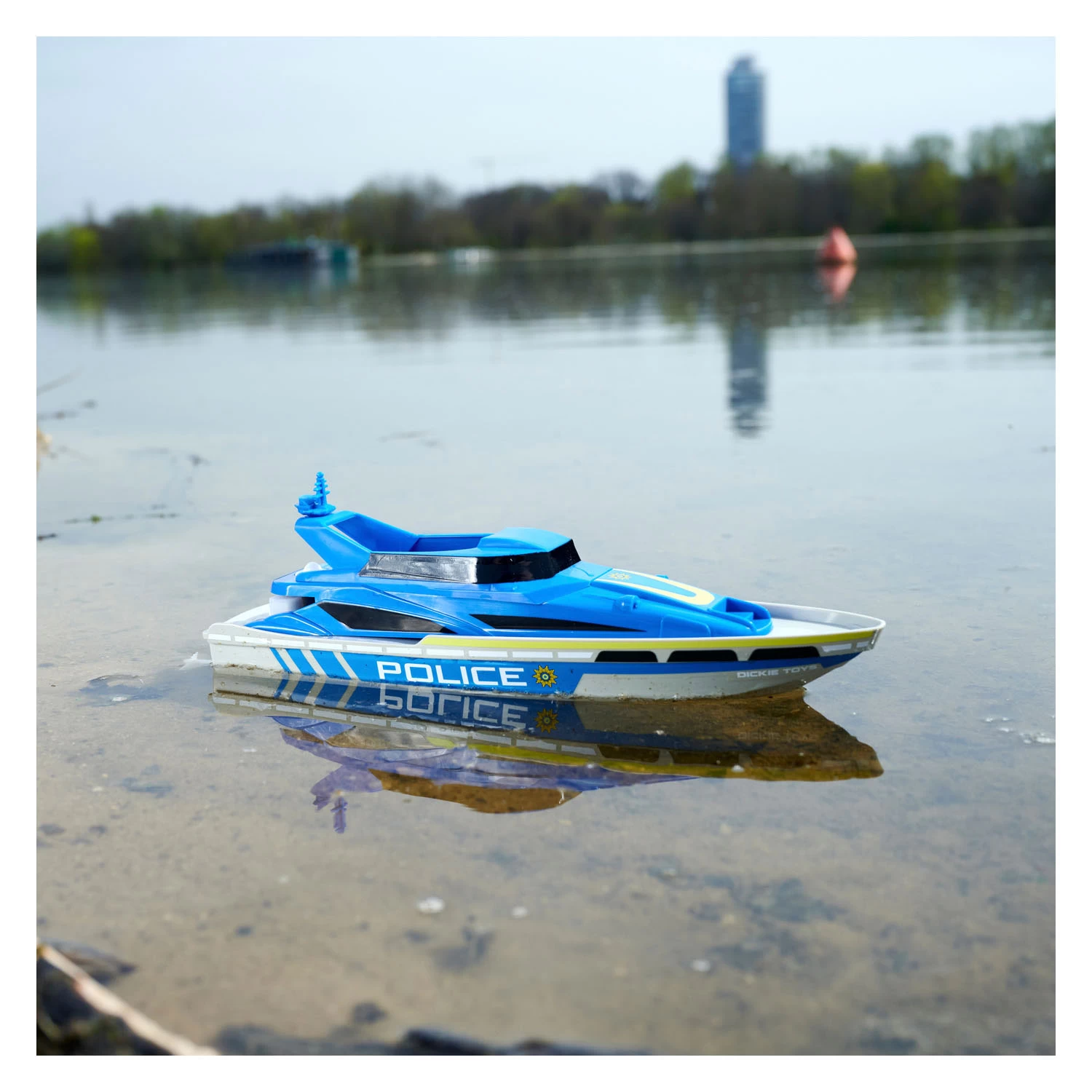 Nehmen Sie die Verfolgung auf mit diesem funkgesteuerten Polizeiboot von Dickie Toys. Dieses wendige Polizeiboot ist wasserdicht und für den Einsatz im Süßwasser konzipiert. Mit dem mitgelieferten Controller (2-Kanal, 2,5 GHz) sind Sie der Kapitän des Schiffes. Funkgesteuertes Boot Das ferngesteuerte Boot kann Geschwindigkeiten von bis zu 2 km/h erreichen und wird mit allen notwendigen Batterien geliefert. Nach dem Auspacken geht es direkt ins Wasser! Im Pool, Teich oder See: Mit diesem ferngesteuerten Polizeiboot rasen Sie im Handumdrehen über das Wasser. Die Batterien sind mit USB-Kabel wiederaufladbar. Geeignet für Kinder ab 6 Jahren. Im Lieferumfang enthaltene Batterien: 2x 1,5 V AA (Sender) + 1x 3,2 V 500 mAh LiFe-Akku (Empfänger).