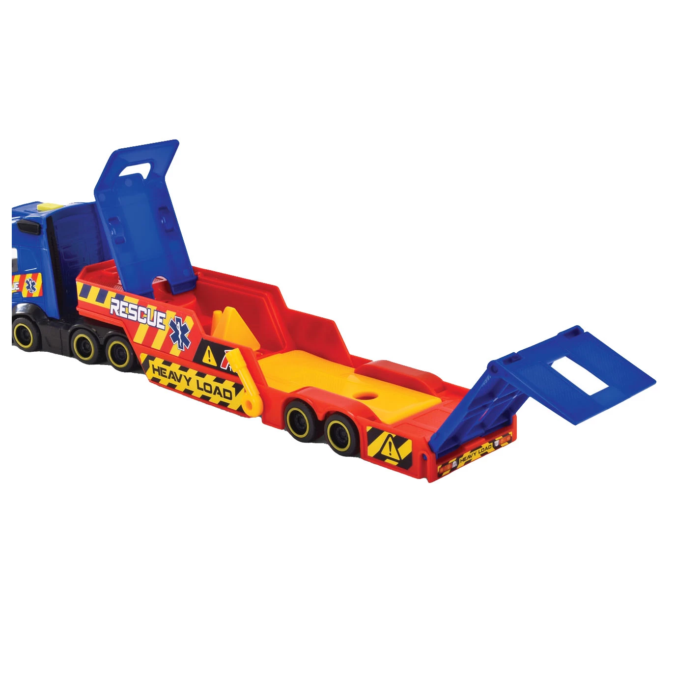 Muss jemand gerettet werden? Sie sind bereit, mit diesem Notfall-Fahrzeugtransporter zu helfen! Das Set enthält einen langen LKW mit Anhänger für den Hubschrauber und ein Auto mit Blinklichtern. Je nach Notfall nutzen Sie das Auto oder den Helikopter. Der LKW kann beides transportieren. Geeignet für Kinder ab 3 Jahren.