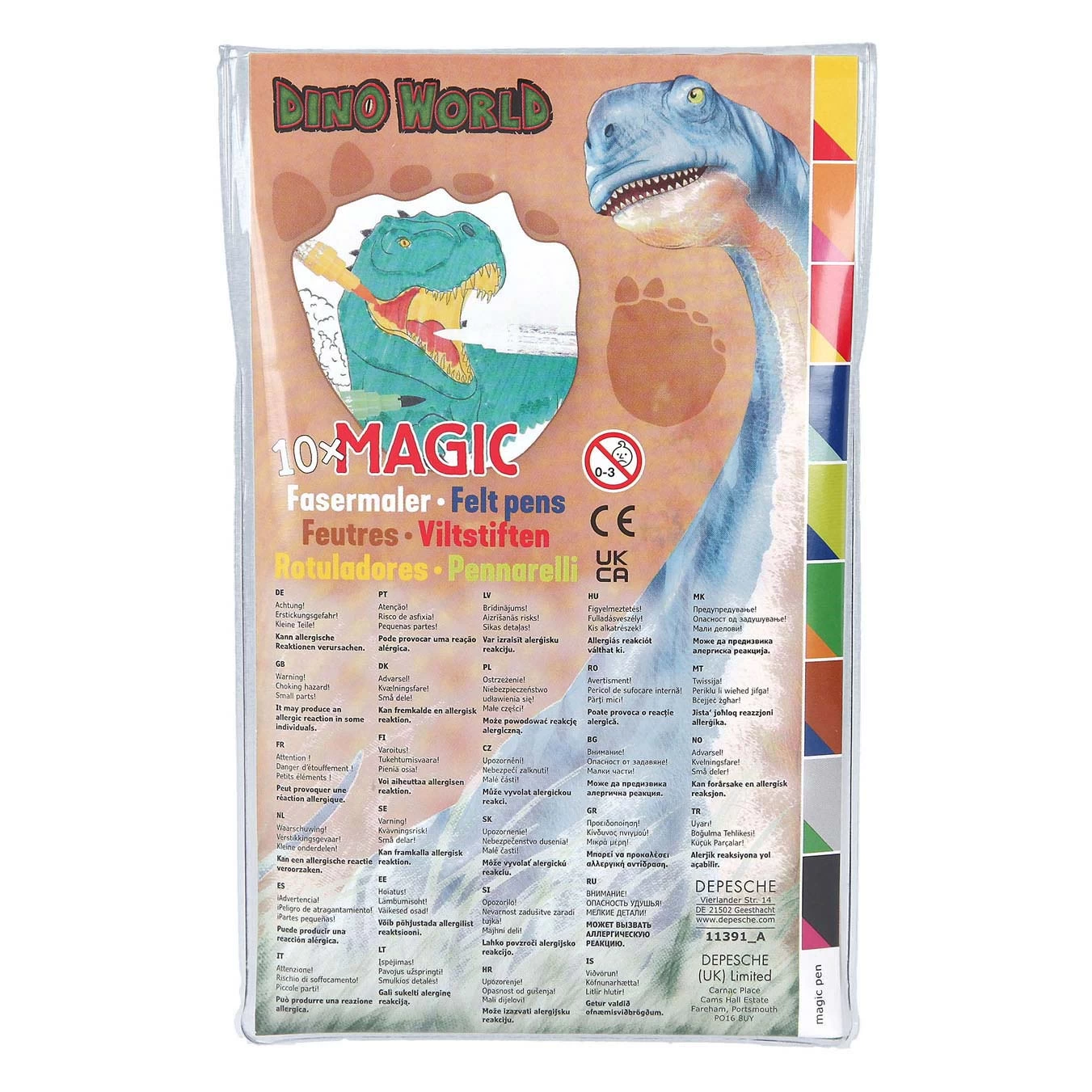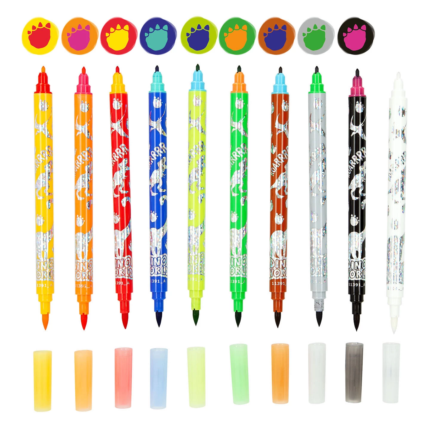 Mit Dino World können Sie jetzt zauberhaft malen. Vor allem mit diesen Doppelfilzstiften und 1 Zaubermarker zum Übermalen der Farben. Dank der magischen Tinte haben Sie nicht 9 Farben, sondern plötzlich 18! Die Doppelstifte haben auf der einen Seite eine Pinselspitze (0,5–2 mm) und auf der anderen Seite eine dünne Spitze (0,5 mm). Im coolen Dino-Look und verpackt in einer transparenten Tüte.
