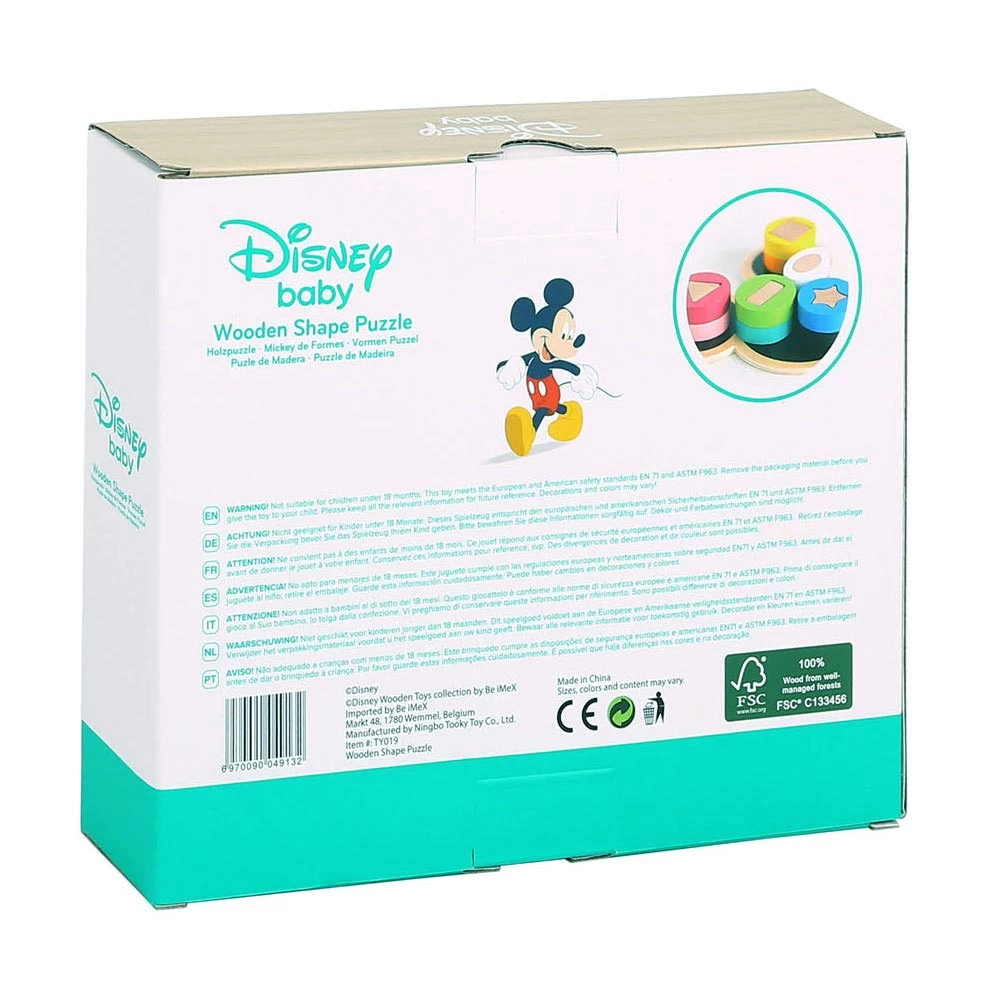 Disney Mickey Mouse Formpuzzle. Mit diesem Formenpuzzle von Mickey Mouse kann Ihr Kleines Formen erkennen und so die Feinmotorik anregen. Das Formpuzzle besteht aus 10 Teilen. Gut zur Förderung der Augen- und Handkoordination. Material: Holz. Abmessungen: 20 x 18 x 3,8 Zentimeter. Geeignet für Kinder von 1 bis 4 Jahren. Inhalt: 10 Blöcke und 1 Brett.
