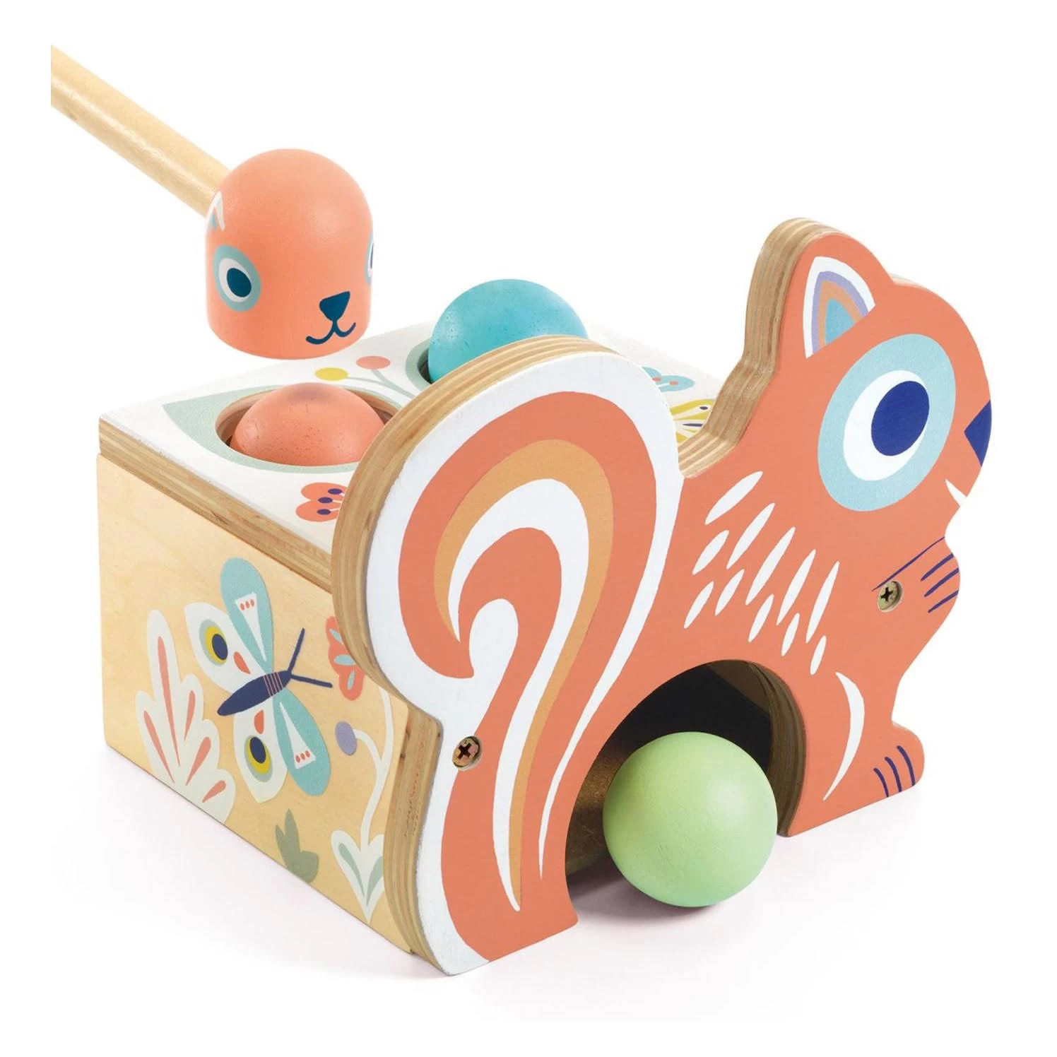 Entwickeln Sie Ihre motorischen Fähigkeiten mit dieser Djeco BabyNut-Box. Legen Sie die Kugeln auf die Holzkiste und schlagen Sie sie mit dem Hammer ein. Durch den Bauch des Eichhörnchens rollen die Kugeln wieder aus der Schachtel. Die Schachtel ist wunderschön mit Gemälden verschiedener Waldtiere verziert. Auf dem Holzhammer ist außerdem ein Eichhörnchengesicht aufgedruckt. Geeignet für Kinder ab 18 Monaten. Die Maße der Box betragen 21,7 mal 18,8 mal 16 Zentimeter.