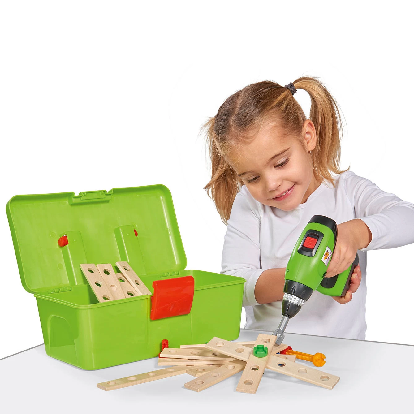 Dieser Werkzeugkoffer von Eichhorn sorgt für realistischen Spielspaß. Der Koffer enthält einen grünen Bohrer mit verschiedenen Bits zum Wechseln, aber auch zahlreiche Konstruktionsteile wie Bretter, Bolzen und Unterlegscheiben. Jetzt können Sie Gelegenheitsarbeiten erledigen, genau wie Mama und Papa! Durch den Zusammenbau der Teile werden räumliches Denken und Feinmotorik gefördert und trainiert. Das in diesem Set verwendete Holz ist 100 % FSC®-Holz. Nach dem Spaß kann alles wieder in die Box gelegt werden. Geeignet ab 3 Jahren.