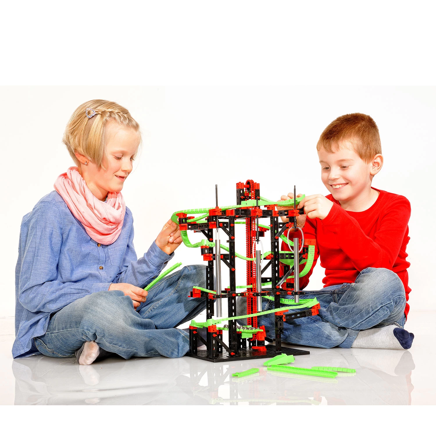 Kombinieren Sie Action und Sound mit dieser spektakulären Murmelbahn von Fischertechnik. Bauen Sie mit den 550 Teilen eine der vier Gleise aus dem Handbuch oder nutzen Sie Ihre eigene Kreativität für eine fantastische Strecke. Die Stahlkugeln flitzen blitzschnell über die Bahn und erzeugen die schönsten Geräusche, wenn sie auf die Klangröhren treffen. Über den rotierenden Trichter landen die Kugeln auf spektakuläre Weise in der nächsten Bahn. Unten angekommen befördern Sie die Murmeln mit dem manuellen Kettenlift wieder nach oben. Sie können diesen Aufzug mit einem optionalen Zusatz automatisieren. Enthält 3 Klangröhren, 8 Stahlkugeln und eine Magnethalterung.