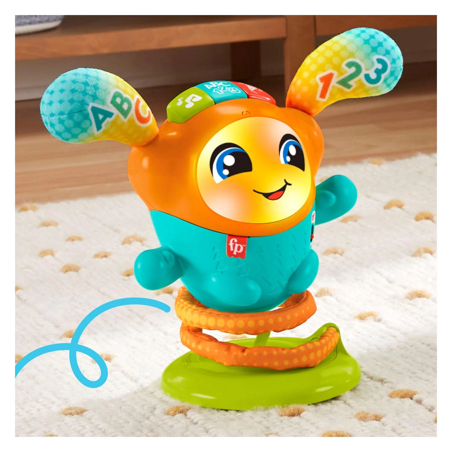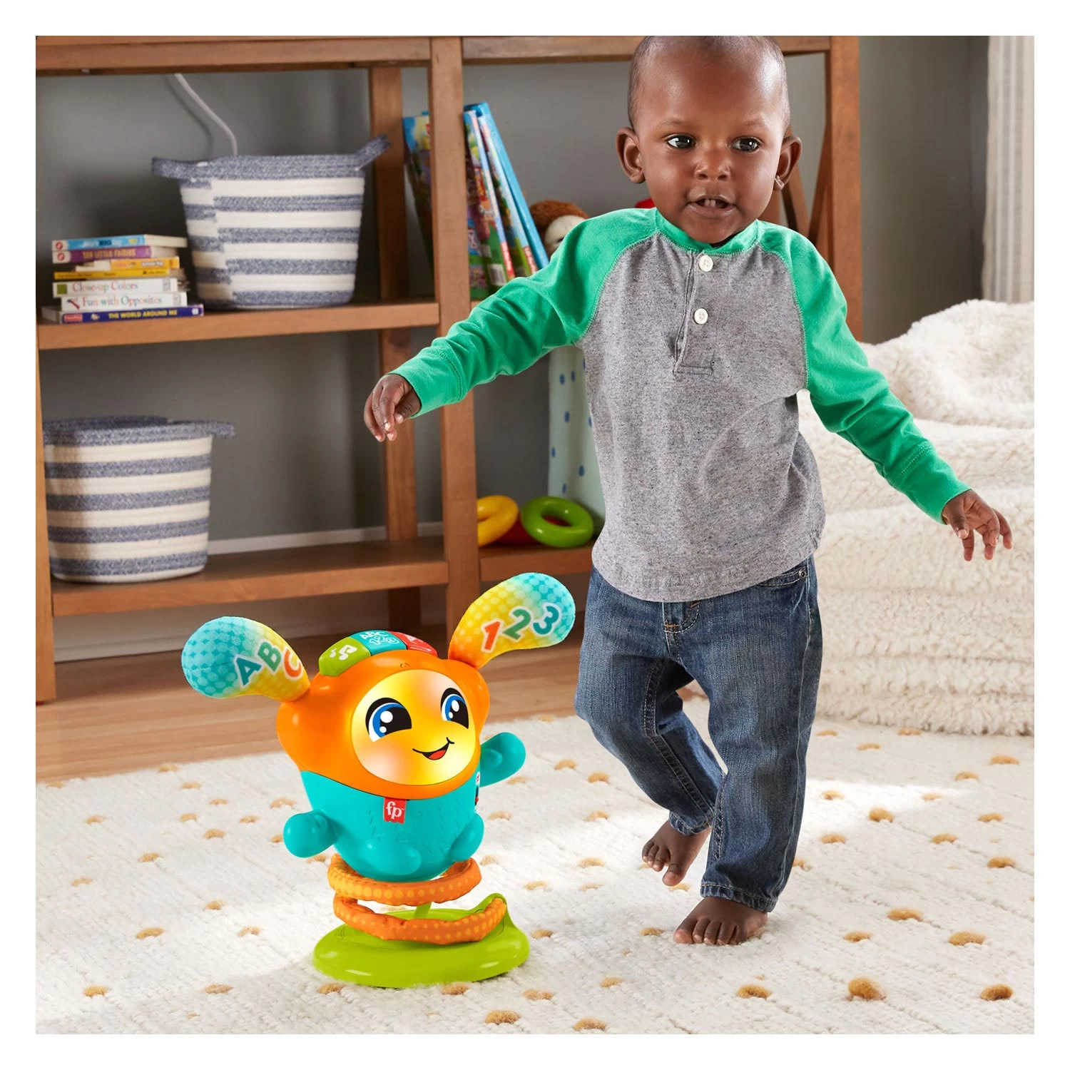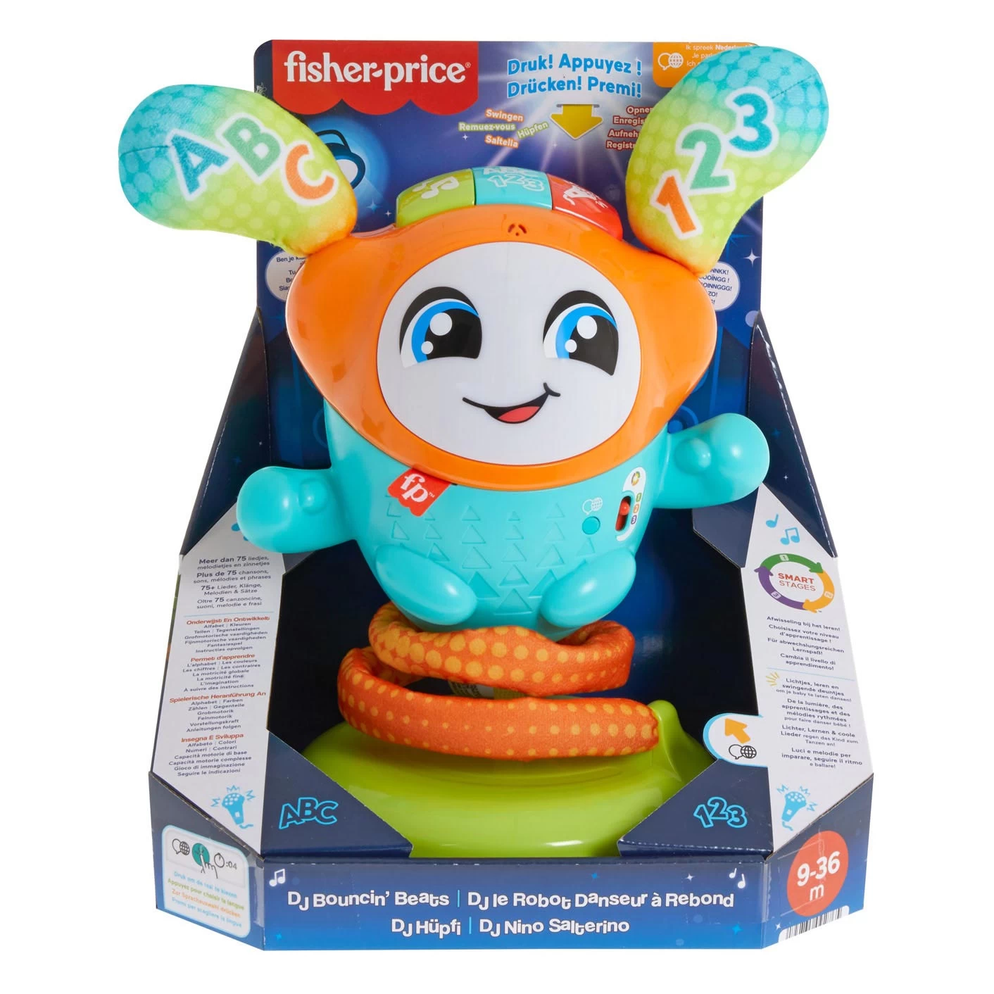 Mit dem Musikspielzeug „DJ Bounce Beats“ können kleine Tänzer Spaß haben, während ihr Tanzpartner aufleuchtet, hüpft und mehr als 75 Lieder, Geräusche und Sätze spielt, um der Party zusätzlichen Glanz zu verleihen. Wird mit 4 AA-Batterien in einer Probierverpackung geliefert. Geeignet für Kinder ab 9 Monaten.