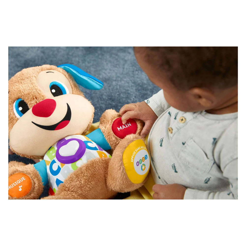 Sag Hallo zu Babys bester Freundin!! Welpe ist weich und kuschelig! Er sorgt dafür, dass der Lernspaß nie aufhört. Er reagiert auf die Berührungen des Babys mit lustigen Sätzen und fröhlichen Mitsingliedern mit mehr als 100 ersten Wörtern, Körperteilen, Formen und mehr. Da sich jedes Baby in seinem eigenen Tempo entwickelt, haben Sie mit der Technologie „Puppy with Grow-With-Your-Own Toy“ die Möglichkeit, die Stufe zu wählen, die am besten zu Ihrem Kind passt. Für jedes der drei Level gibt es Lieder, Geräusche und Phrasen. Die farbigen Lichter von Puppys leuchtendem Herzen blinken sogar im Takt der Musik! Stufe 1 �?? Untersuchen �?? Wenn Ihr Kind die Hände, Füße, das Herz, die Nase oder das Ohr des Welpen drückt, hört es die ersten Wörter, Farben, das ABC, Körperteile und mehr! Stufe 2 – Ermutigung – Auf dieser Stufe werden die Kleinen dazu ermutigt, zu zählen, Farben zu finden und auf Körperteile zu zeigen. Sie werden belohnt, wenn sie es richtig machen! Stufe 3 �?? Fantasie �?? Der Welpe ist bereit, Rollenspiele zu spielen und regt die Fantasie der Kleinen mit Liedern und Sätzen zum Mitsingen an. Sie lernen spielerisch neue Wörter!
