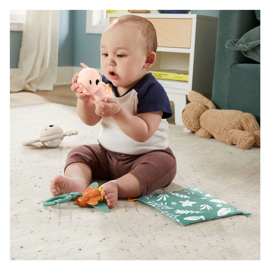 Babys werden den sensorischen Spaß des So Many Senses-Geschenksets von Fisher-Price lieben. Dieses Set aus 4 sensorischen Spielzeugen für Babys umfasst einen BPA-freien Beißring mit herausnehmbarem Ball, einen weichen Axolotl mit Geräusch, eine strukturierte Schmetterlingsrassel und eine weiche, knisternde Oberfläche mit Band. Dieses Spielzeug ist so konzipiert, dass es von kleinen Händen sicher gehalten werden kann. Es trägt zur Verbesserung der Feinmotorik bei und fördert gleichzeitig die Entwicklung des Seh-, Hör- und Tastsinns Ihres Babys. Der Schmetterling und die Knirschfläche lassen sich mit einem praktischen Link für unterwegs einfach an einem Baby-Fitnessstudio, einer Wickeltasche oder einem Kinderwagen befestigen. Das Spielzeugset wird in einer Geschenkbox geliefert, ideal zum Verschenken.
