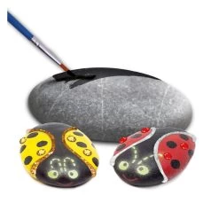 Das Set enthält 4 wunderschöne Kieselsteine, 4 Farbtöpfe (rot, schwarz, gelb und blau), einen Pinsel, einen Topf mit im Dunkeln leuchtender Farbe, 2 Tuben Glitzer und dekorative Diamanten. Wenn man sie eine Weile im Licht liegen lässt, leuchten sie im Dunkeln!