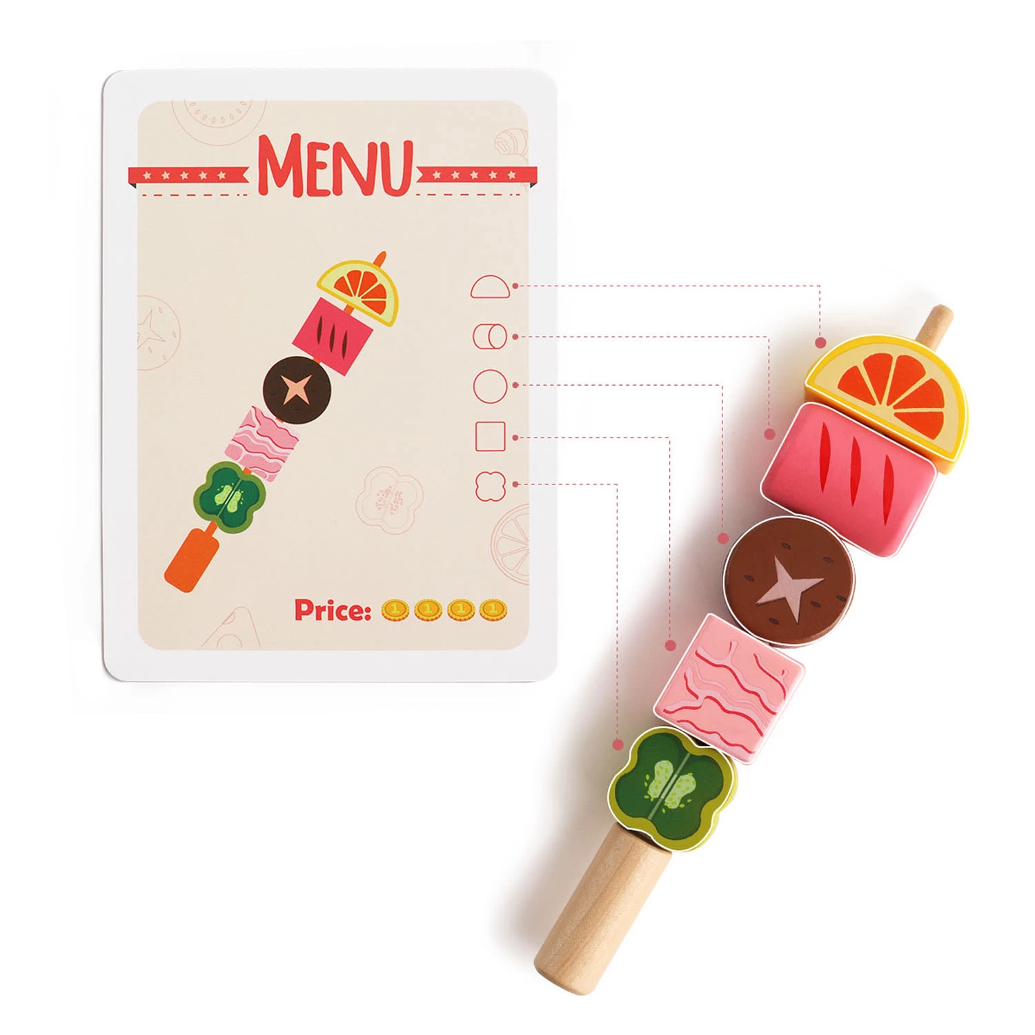 Mit dieser Sommer-Spielbox können Sie ein köstliches Barbecue für die ganze Familie zubereiten! Zünden Sie den Grill vorher an, damit er aufheizen kann, und bereiten Sie in der Zwischenzeit mithilfe der Spielkarten Spieße mit Gemüse und Fleisch zu. Oder machen Sie Ihre eigene Kreation! Fügen Sie etwas Salz für zusätzlichen Geschmack hinzu! Die Spielbox enthält eine Grillbox, zwei Spieße, hölzerne Gemüse-/Obst-/Fleischfiguren, zwei Teller, Spielkarten, Salz und eine Zange.