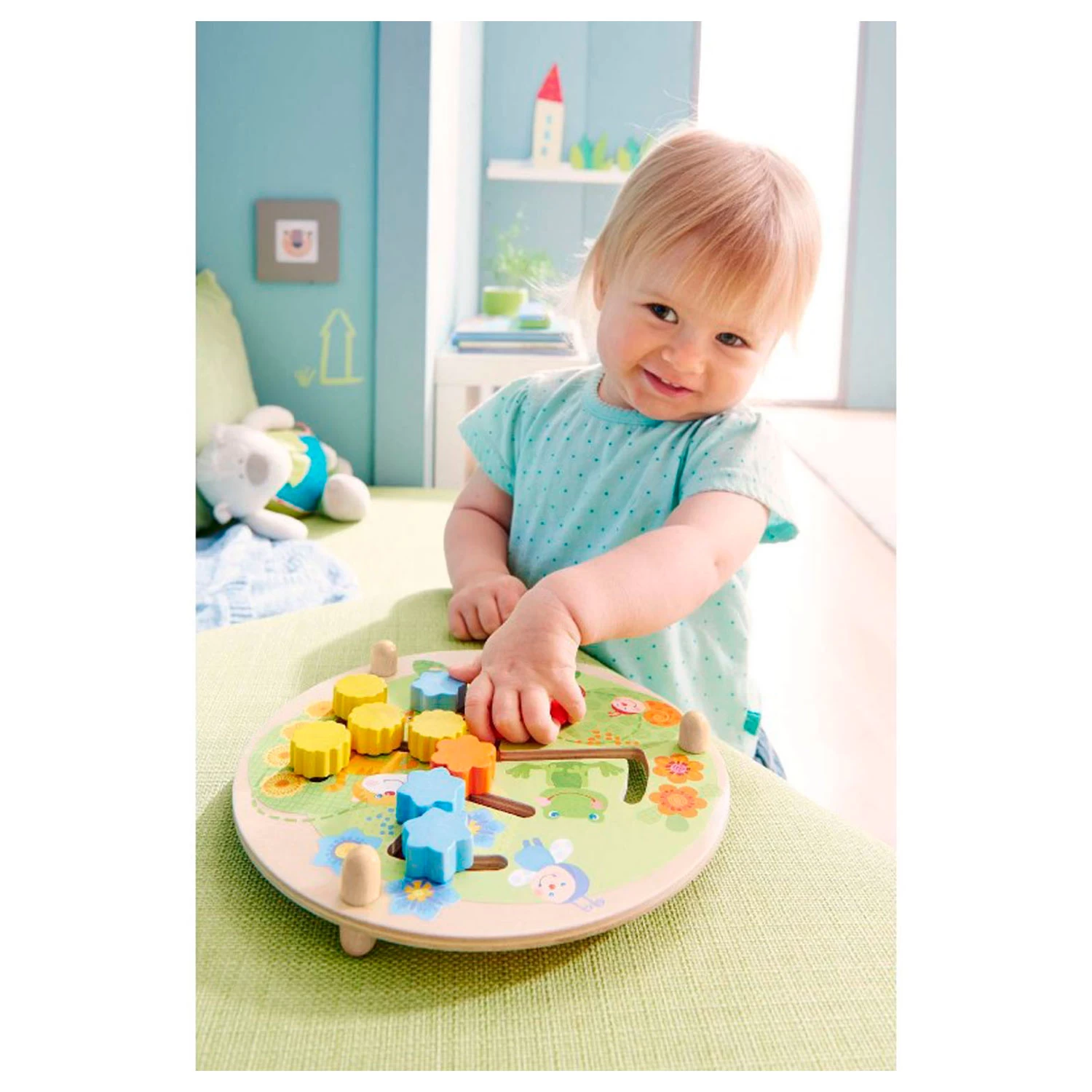 Schieben Sie die farbigen Blumen auf dem Haba Mororiek-Brett von links nach rechts und von oben nach unten. Können Sie die Blumen nach Farbe und Menge sortieren? Das Gleitbrett ist 2-seitig nutzbar. Auf der Vorderseite ist ein fröhliches Bild eines Blumengartens zu sehen. Auf der Rückseite befinden sich die Zahlen 1 bis 4 in 4 verschiedenen Farben. Das Haba Motor Board fördert die Feinmotorik, die Auge-Hand-Koordination sowie das Erkennen von Farben und Zahlen. Geeignet für Kinder ab 1 Jahr.