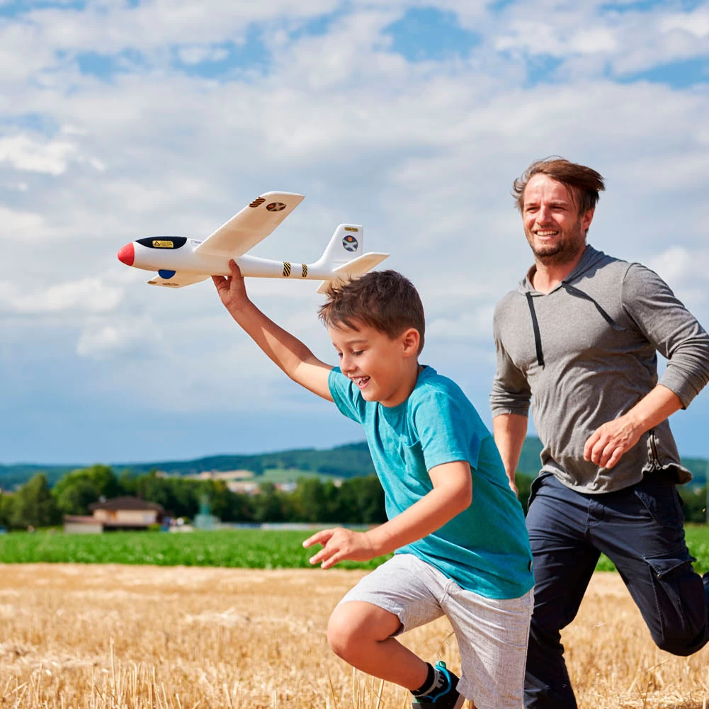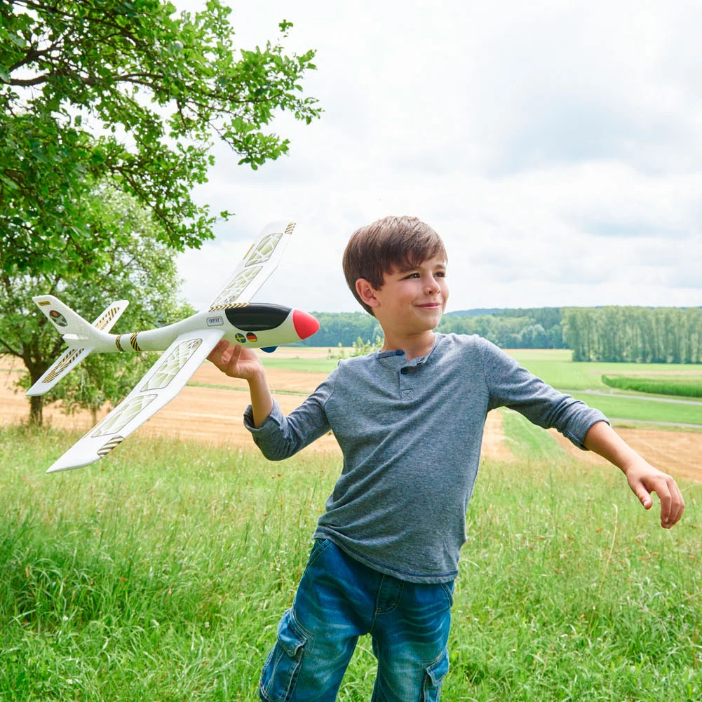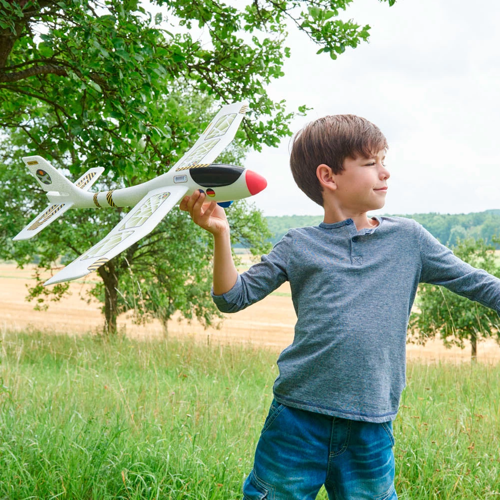 Fassen Sie das Flugzeug am Rumpf unter den Flügeln und … starten Sie es! Werfen Sie das Wurfflugzeug mit großem Schwung und lassen Sie es durch die Luft fliegen. Schöne Zusatzfunktion: Drehen Sie den Heckflügel und das Flugzeug fliegt spektakuläre Loopings!
