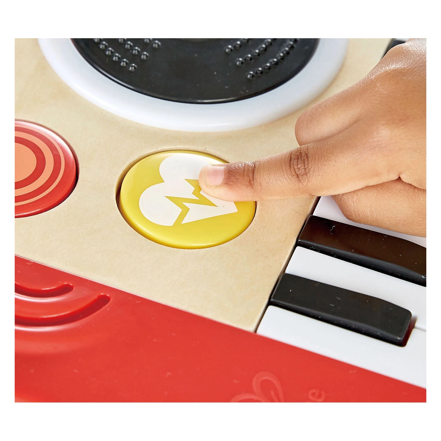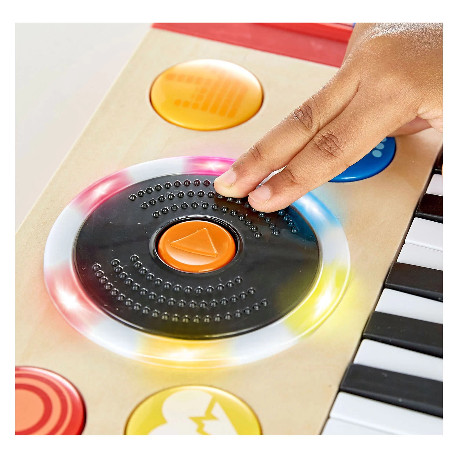 Hey DJ, spiel ein schönes Lied! Dieses DJ-Set für Kinder steckt voller lustiger Sounds, die es zu entdecken gilt. Spielen Sie mit einem von 4 Instrumentenklängen, fügen Sie einen von 18 Soundeffekten hinzu und gestalten Sie die Szene mit einer von 5 Hintergrundmelodien. Sie können das Tempo mit dem Schieberegler ändern. Mixen, Scratchen und bringen Sie die Tanzfläche zum Swingen! Eigenschaften DJ-Spielzeug für Kinder • Mit 4 Instrumentenklängen, 18 Soundeffekten und 5 Hintergrundmelodien • Aus Holz • Betrieb mit 3 AA-Batterien (im Lieferumfang enthalten) • Abmessungen: 34 x 18,5 x 4 Zentimeter • Geeignet für Kinder ab 12 Monaten