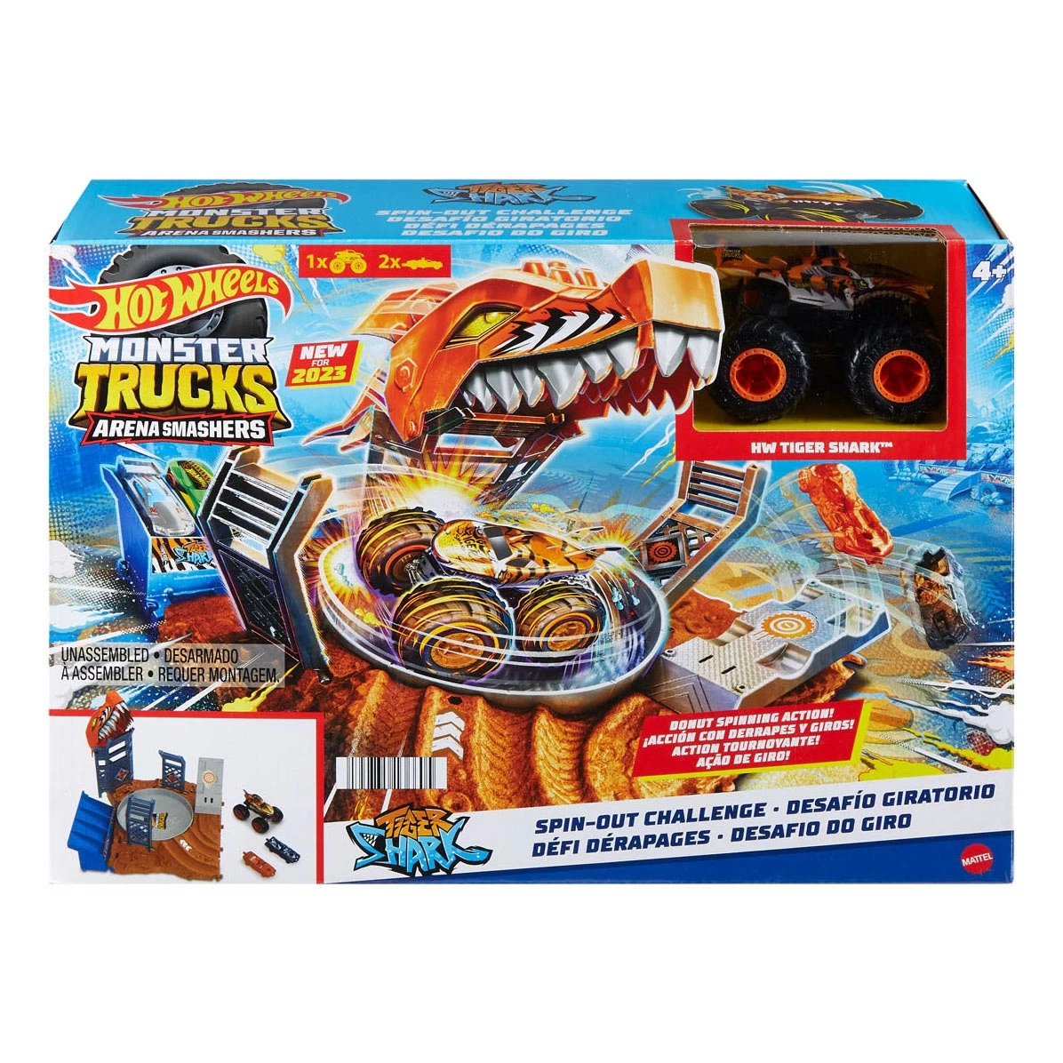 Mit dem Hot Wheels Monster Trucks Arena Slopers Tiger Shark Spin-Out Challenge-Spielset können Sie die Kraft und Gewalt der Kollisionen wirklich in Ihren Händen spüren. Drehen Sie den mitgelieferten Tigerhai auf einer Basis, um die speziellen Quetschpunkte zu treffen und den riesigen feindlichen Hai zu besiegen. Wenn Sie zur falschen Zeit an der falschen Stelle landen, landet der Truck im Rachen des Hais! Die Basis des Sets bewegt und wackelt, sodass Kinder die Kollisionen und Stunts wirklich spüren und alles noch spannender wird. Das Set enthält zwei Knautschautos und kann mit anderen Sets verbunden werden, um eine Arena voller Hindernisse zu bauen. Pro Stück erhältlich, je nach Verfügbarkeit. Farben und Dekorationen können variieren.