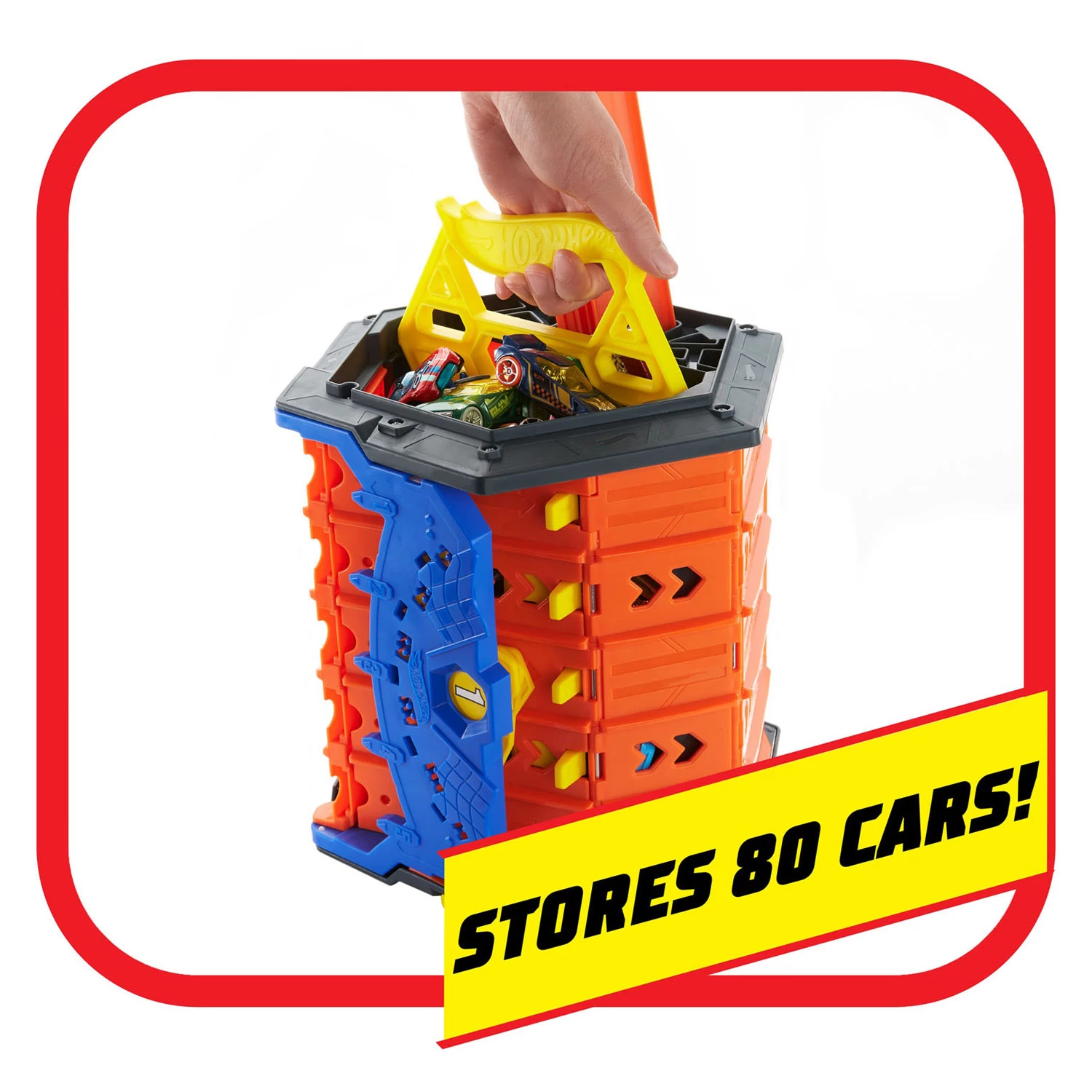 Die Hot Wheels Roll-Out-Rennstrecke vereint Rennen und Aufbewahrung in einem coolen und praktischen Paket! Die Hot Wheels Roll-Out-Rennstrecke ist auch ein Eimer, der bis zu 80 Metallfahrzeuge und 5 Streckenabschnitte aufnehmen kann. Inklusive Griff zum einfachen Tragen.