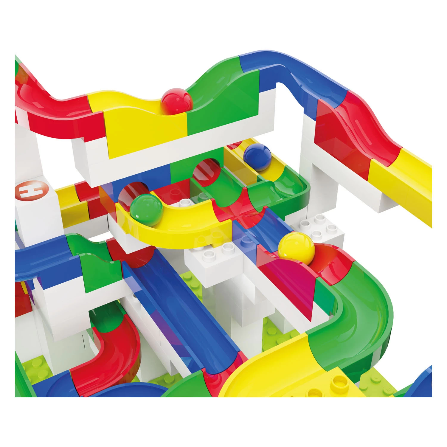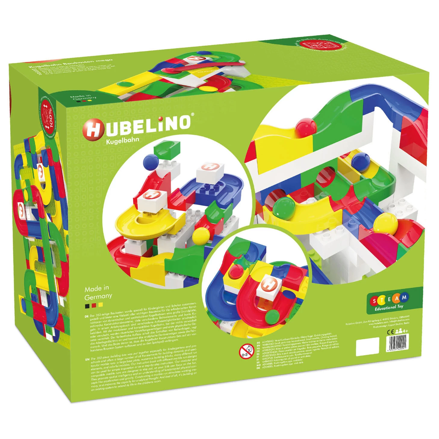 Eine große Kiste gefüllt mit hochwertigem und langlebigem Baumaterial aus Kunststoff: die Hubelino Murmelbahn KIGA Schulset-Baukiste. Dieses enthält 352 Bauteile, darunter eine große Bauplatte, allerlei Kurven, Schrägen und Bausteine zum Aufsteigen. Lassen Sie Ihrer Fantasie und Kreativität freien Lauf, um die besten Kugelbahnen zu bauen, oder nutzen Sie die Beispiele in der Anleitung oder in der Hubelino App. Der Hubelino Kugelbahn-KIGA-Schulset-Bausatz enthält 15 Murmeln.