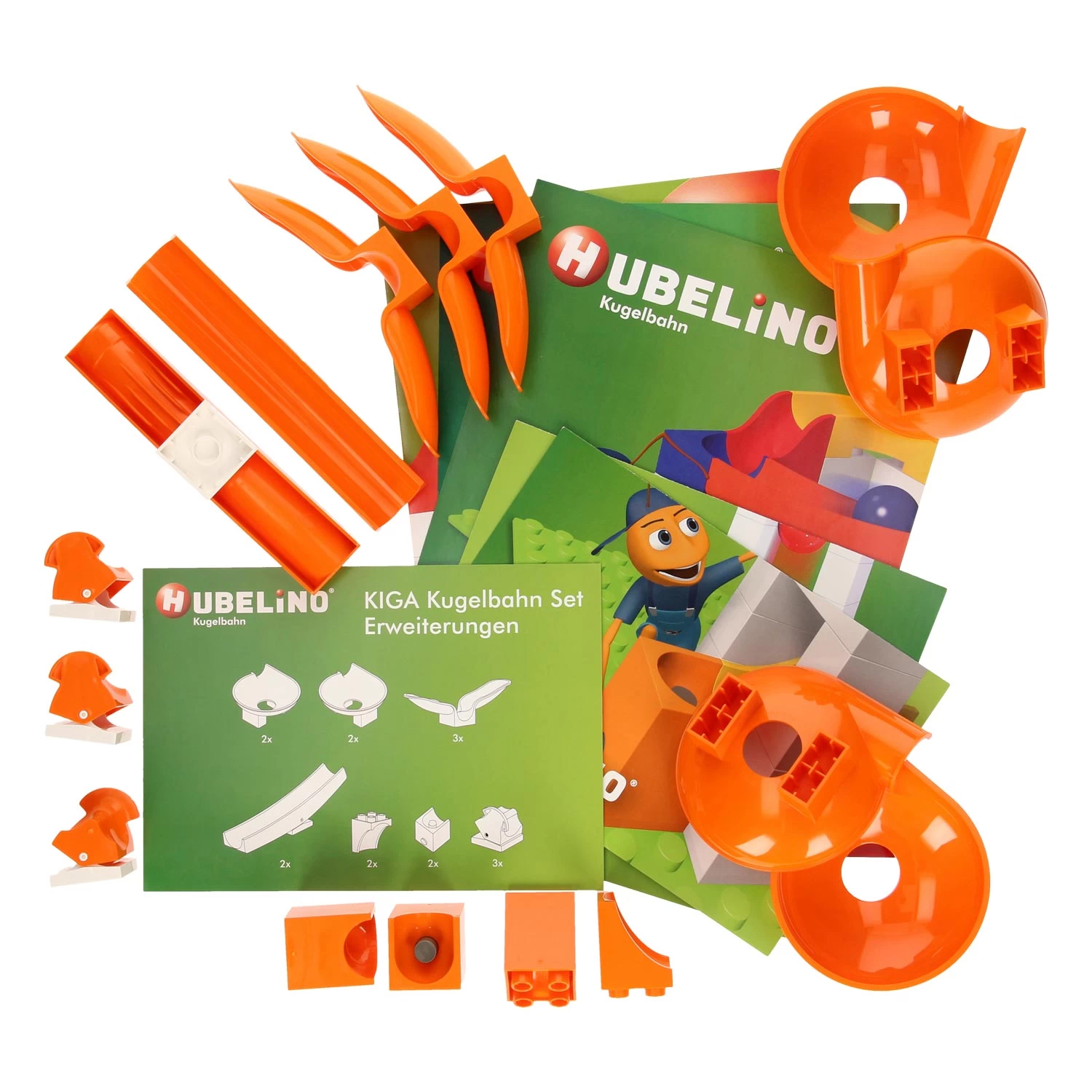 Eine Kiste gefüllt mit hochwertigem und langlebigem Baumaterial aus Kunststoff: das Hubelino Murmelbahn-KIGA-Schulset-Erweiterungsset. Dieses enthält 16 orangefarbene Bauteile zur Erweiterung Ihrer Hubelino -Kugelbahn: 4 Trichter, 3 Doppelgleiselemente, 2 Kippgleiselemente, 2 Startblöcke, 2 Steilhänge und 3 kleine Kippblöcke. Lassen Sie Ihrer Fantasie und Kreativität freien Lauf, um die besten Murmelbahnen zu bauen, oder nutzen Sie die Beispiele auf den Anleitungskarten oder in der Hubelino App. Mit dem Hubelino Kugelbahn-KIGA-Schulset-Erweiterungsset macht das Bauen und Murmelspielen mit Hubelino noch mehr Spaß!