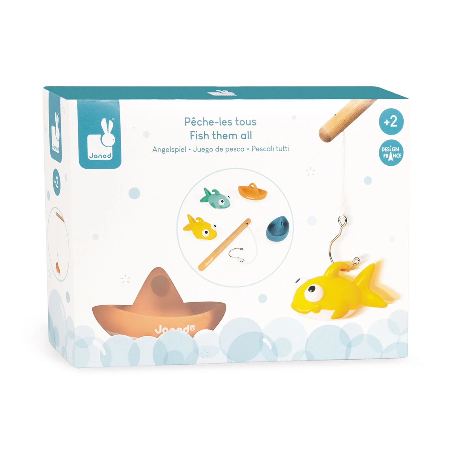 Dieses Angelspiel von Janod ist ein toller Badespaß. Fange die Boote und die kleinen Fische so schnell wie möglich mit der Angelrute! Das Angelspiel fördert die Beweglichkeit und Konzentration Ihres Kindes. Entdecken Sie auch, was passiert, wenn Sie auf das Boot oder den Bauch des Fisches drücken. Das Set enthält eine Angelrute, zwei Fische und zwei Boote.