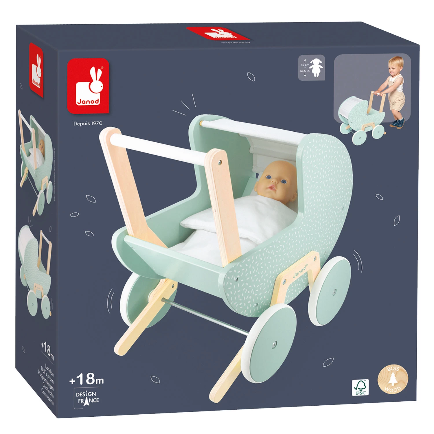 Dieses Holzspielzeug, ein weicher grüner Puppenwagen, ist ideal, um Ihr Kind bei seinen ersten Entdeckungstouren zu begleiten. Das Kind kann die Erwachsenen nachahmen und seine Puppen und Plüschtiere mit auf die Fahrt nehmen. Für optimale Sicherheit ist dieser Kinderwagen mit einem abnehmbaren Kippschutzsystem ausgestattet, das Sie abnehmen können, wenn sich Ihr Kind beim Gehen wohler fühlt. Im Lieferumfang sind eine schöne Decke und ein Kissen enthalten, damit die Plüschtiere und Puppen bequem im Kinderwagen liegen. Holzräder mit Gummischicht, die keine Flecken auf dem Boden hinterlassen. Kapuze aus Stoff.