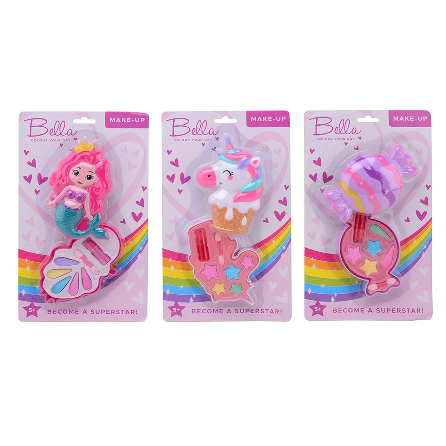 Machen Sie sich noch schöner mit Ihrem persönlichen Make-up-Set! Das Make-up-Set enthält vier Lidschattenfarben, einen Applikator und Lippenstift. Welchen Look wählst du heute? Geeignet für Kinder von 5 bis 12 Jahren. Preis pro Stück, verschiedene Designs / Farben werden gemischt.