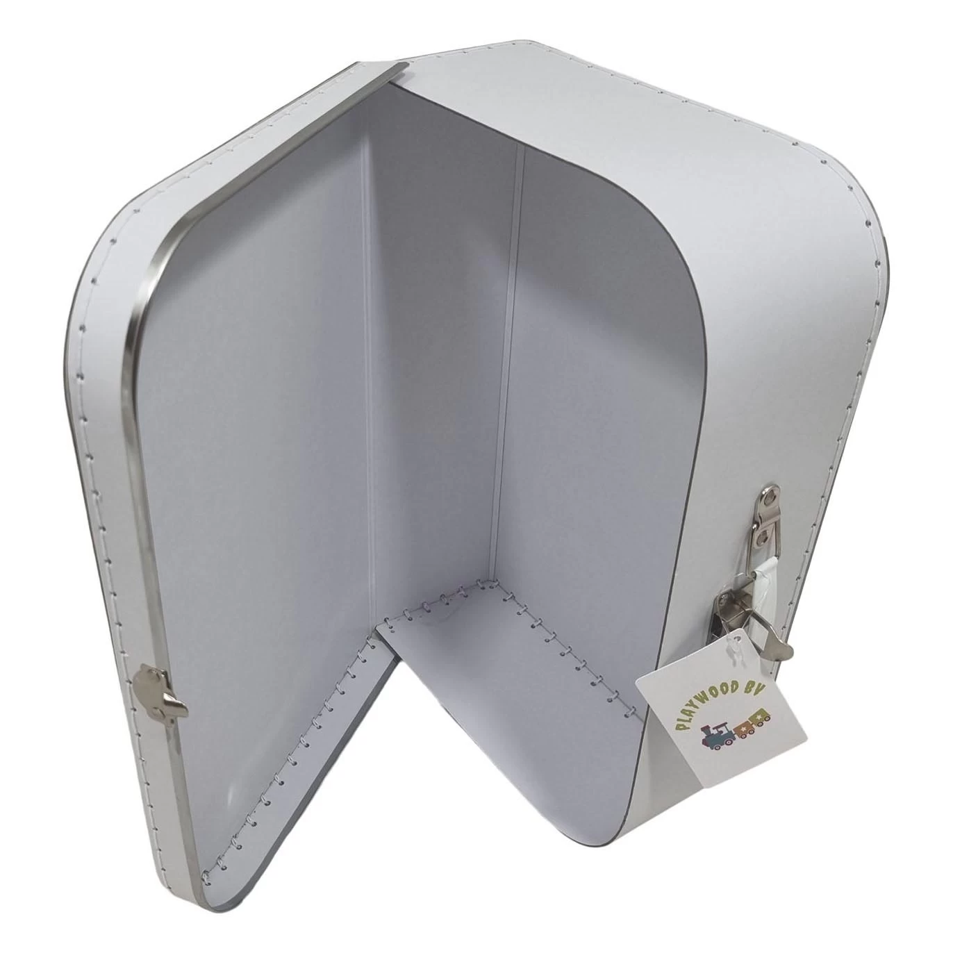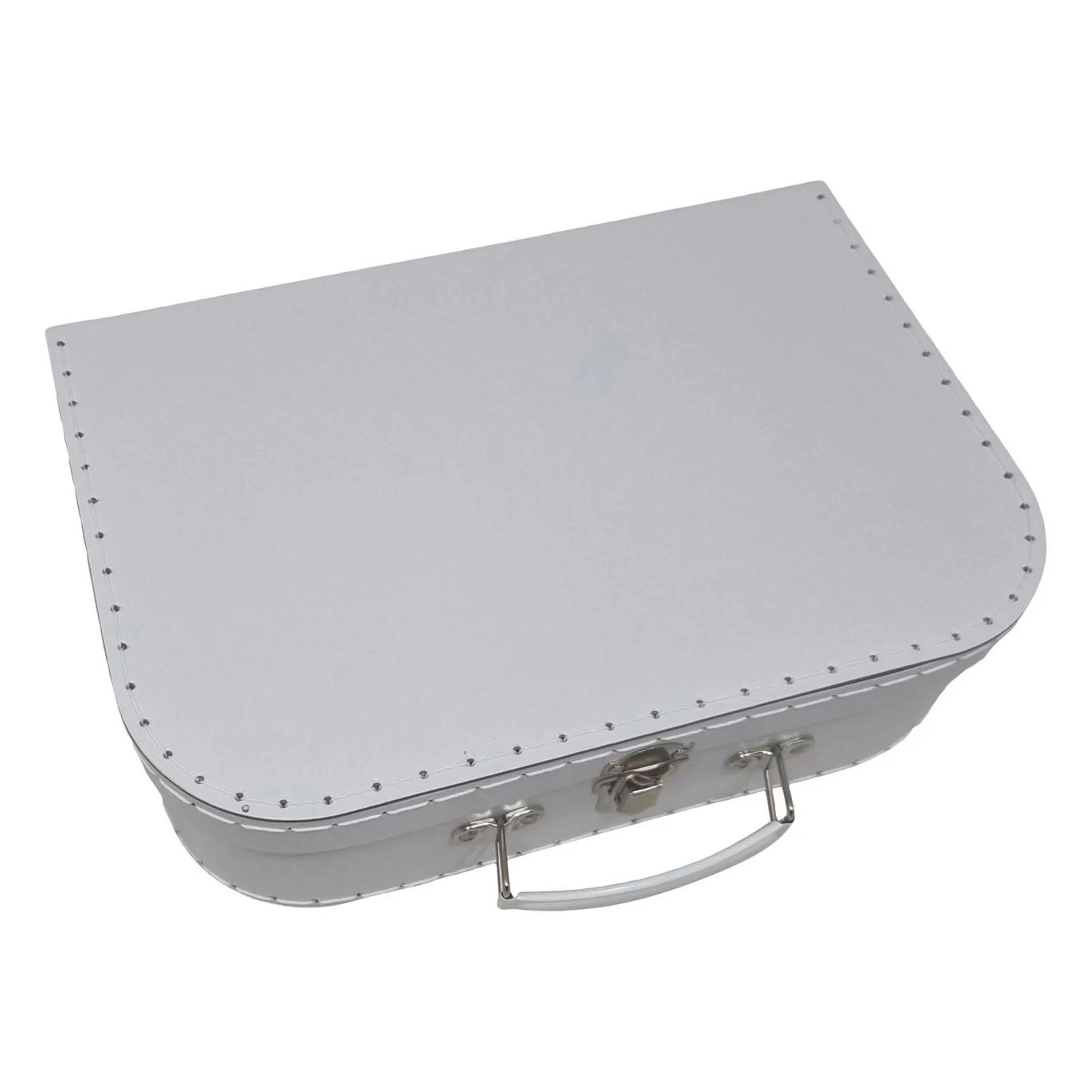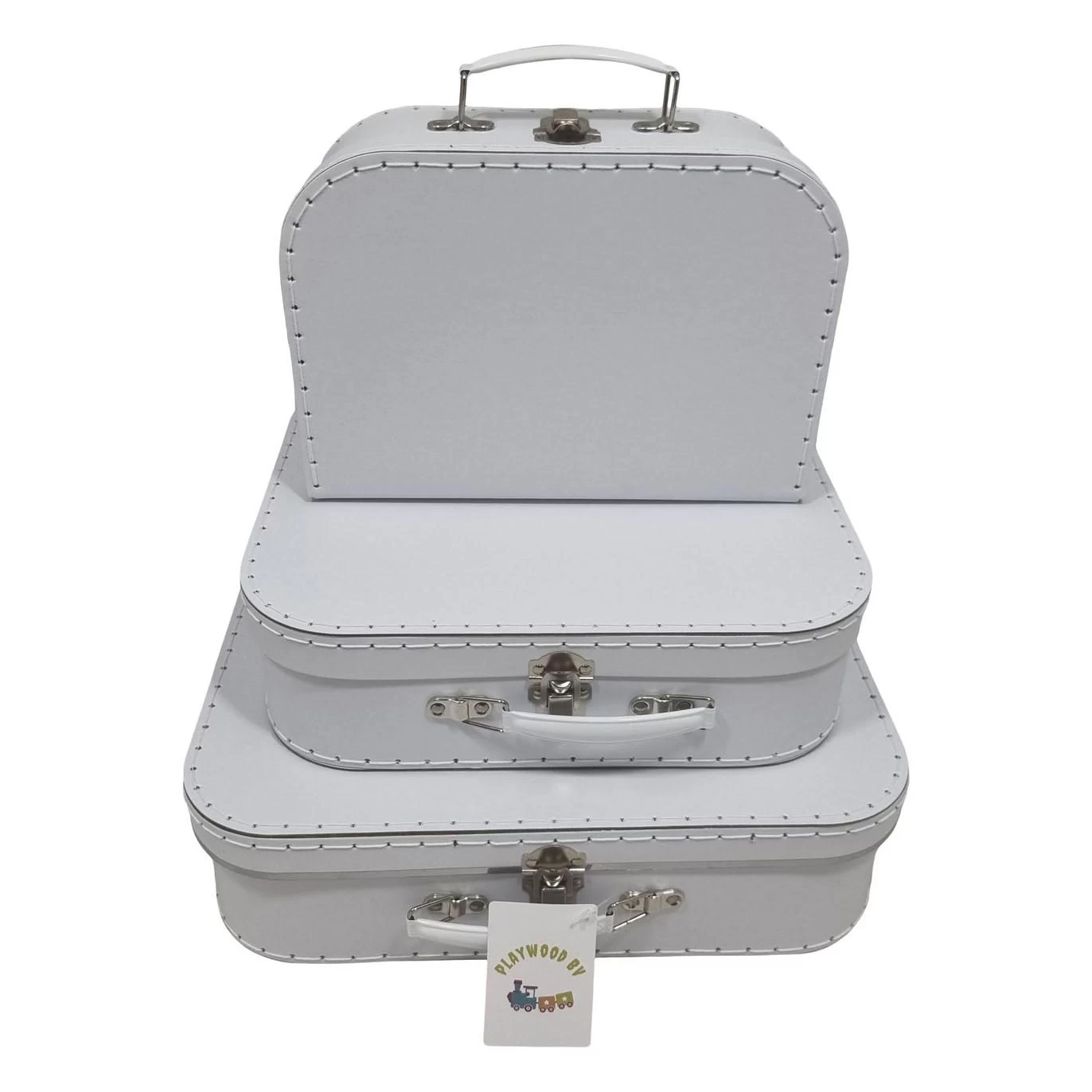 Set aus drei weißen Kartonkoffern. Verwenden Sie sie zum Aufbewahren von Spielzeug oder für ein lustiges Bastelprojekt! Da die Koffer weiß sind und aus Pappe bestehen, können Sie mit den unterschiedlichsten Materialien arbeiten. Das Set besteht aus drei Koffern in unterschiedlichen Größen: