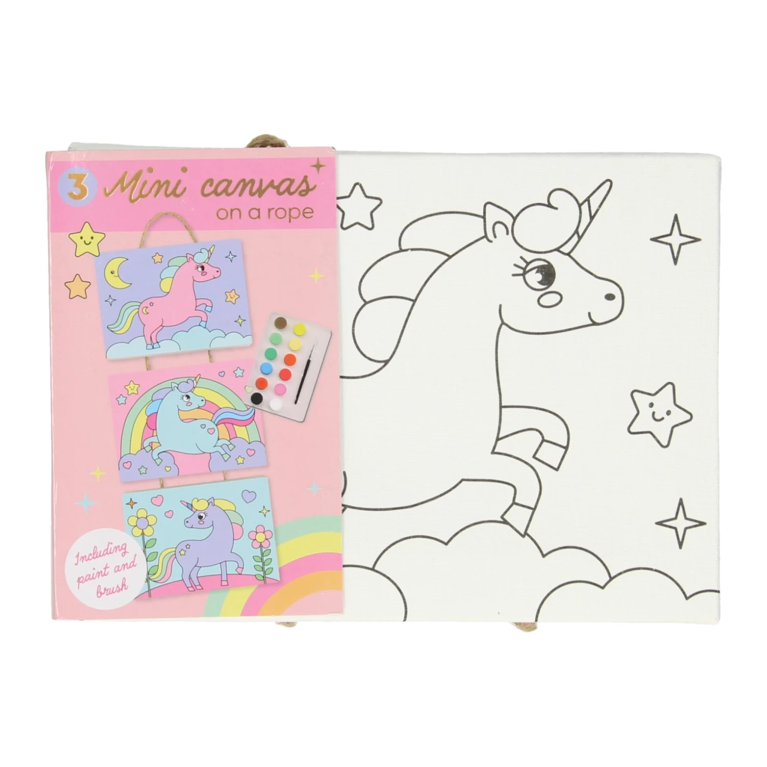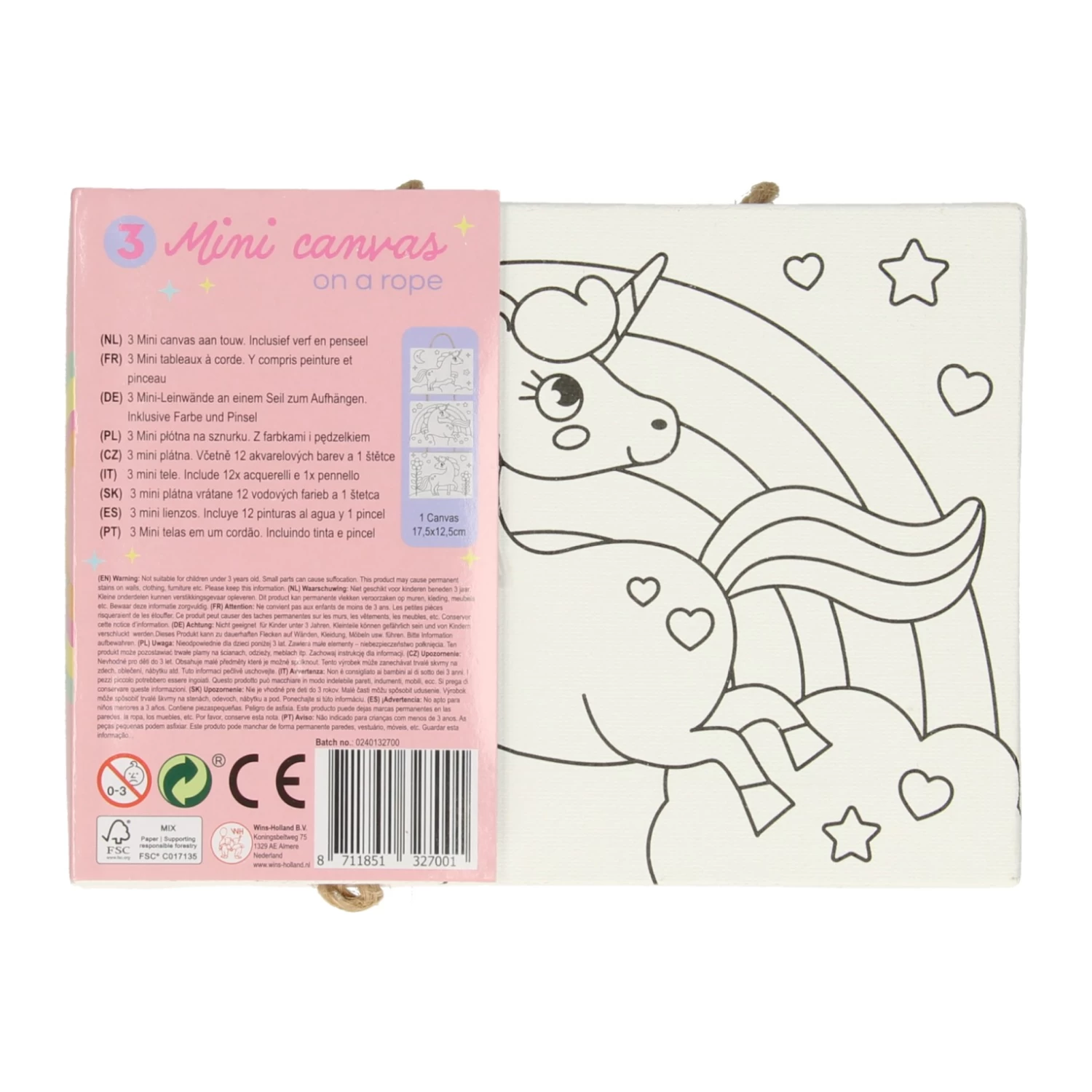Set aus 3 Leinwänden mit fröhlichen Bildern von Einhörnern. Malen Sie die Einhörner mit dem mitgelieferten Pinsel und den 12 Farben! Nach dem Bemalen können Sie die Leinwände als Triptychon untereinander aufhängen.