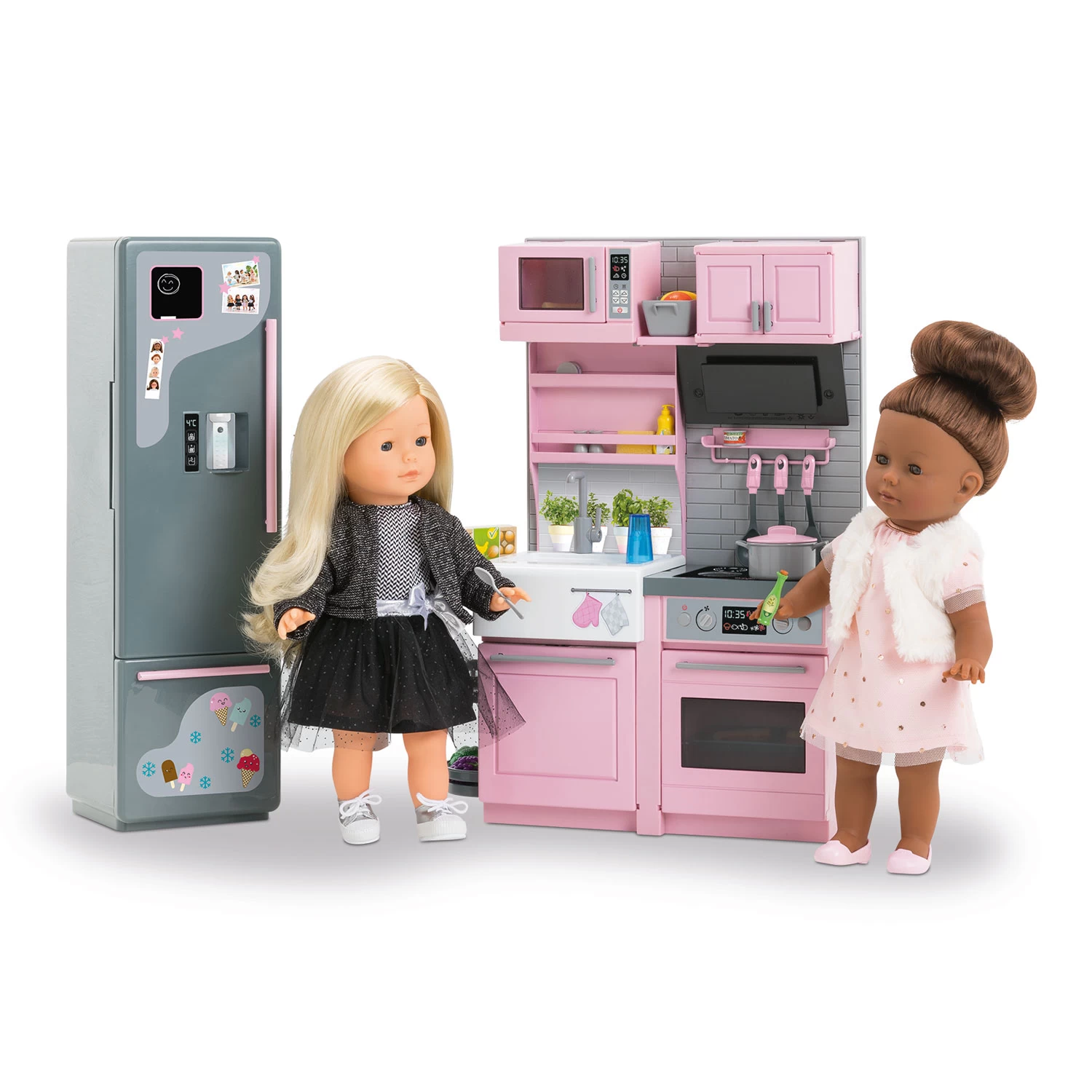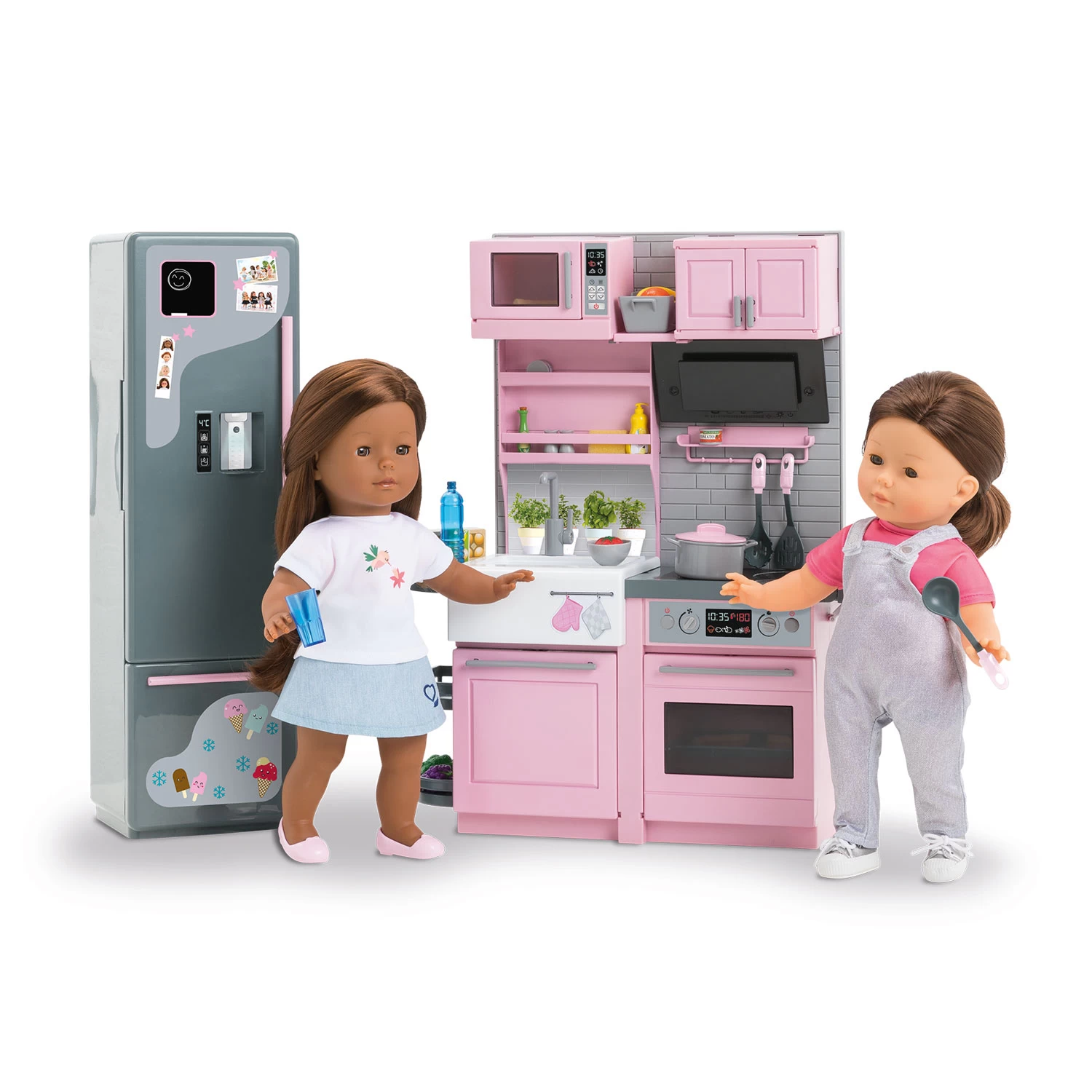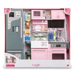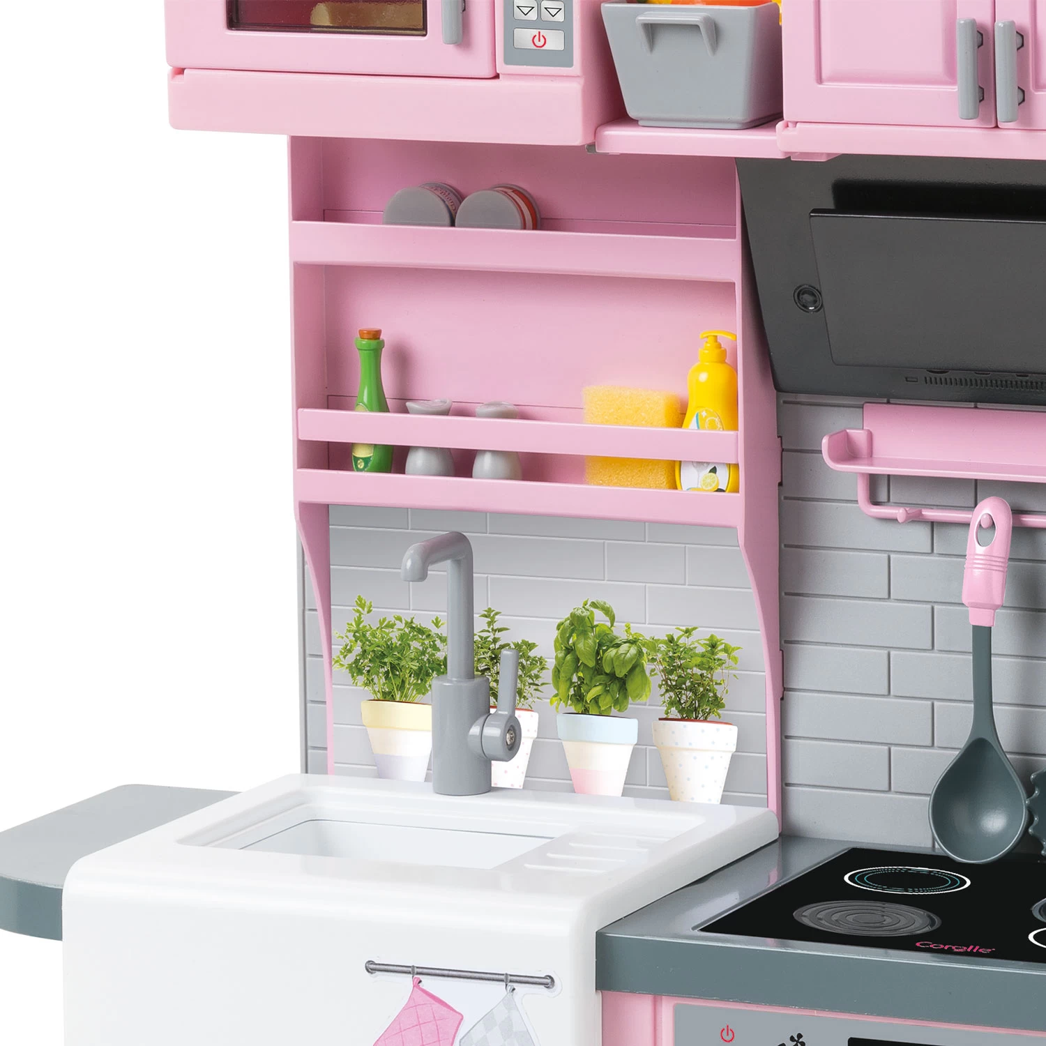Wow, ab sofort kann Ihr Corolle auch in der eigenen Küche, inklusive Kühlschrank, köstliche Gerichte zubereiten! Das Kochfeld funktioniert, der Backofen macht Geräusche und auch der Kühlschrank erzeugt Licht und Ton. Die Küche ist mit vielen Accessoires wie Pfannen, Essgeschirr, Getränken und Lebensmitteln ausgestattet. Genießen Sie das Kochen mit Ihrer Puppe und bevor Sie es merken, stehen die leckersten Gerichte auf dem Tisch. Betrieb mit 6 Knopfzellenbatterien (Batterien sind im Lieferumfang enthalten). Geeignet für Corolle Puppen von 36 Zentimetern.