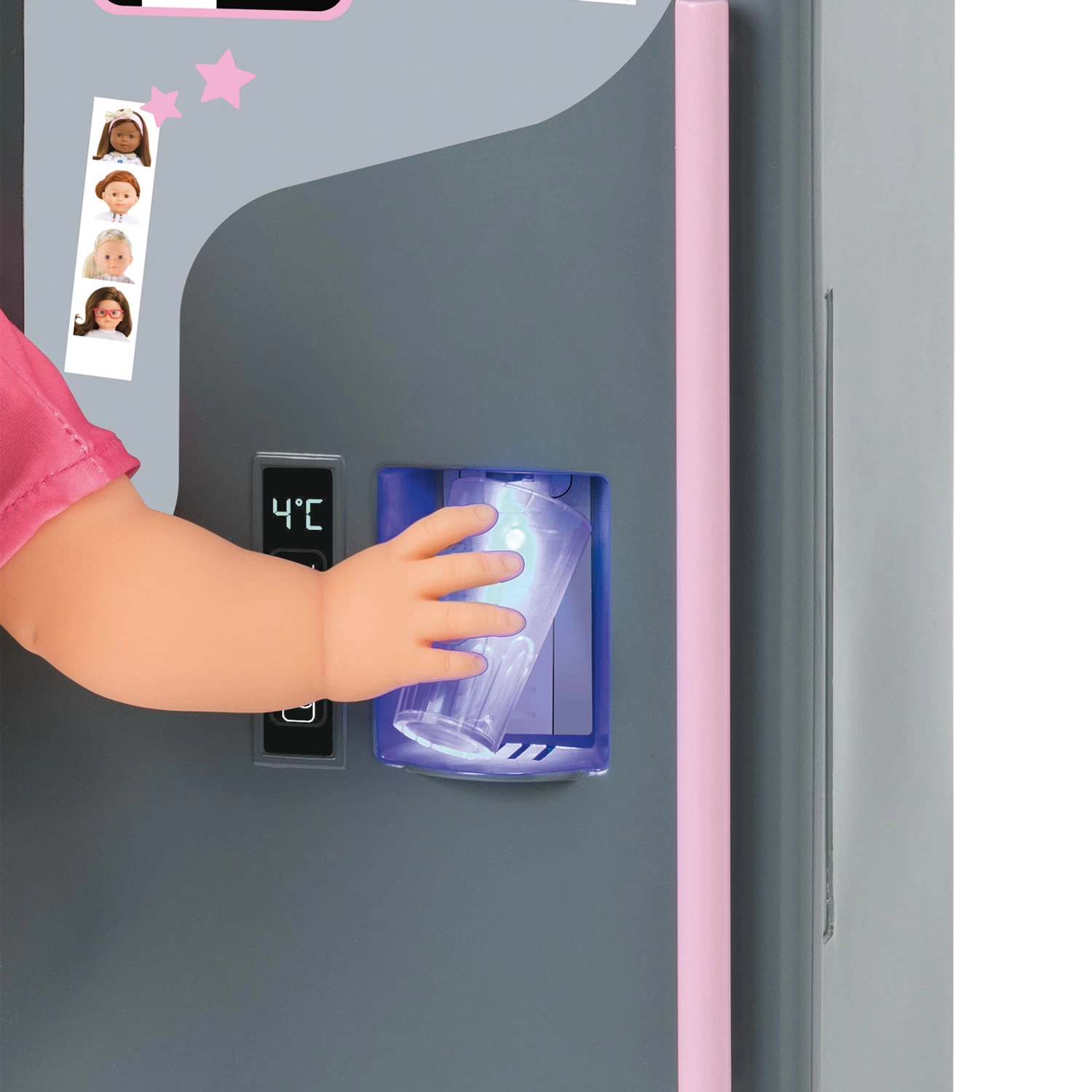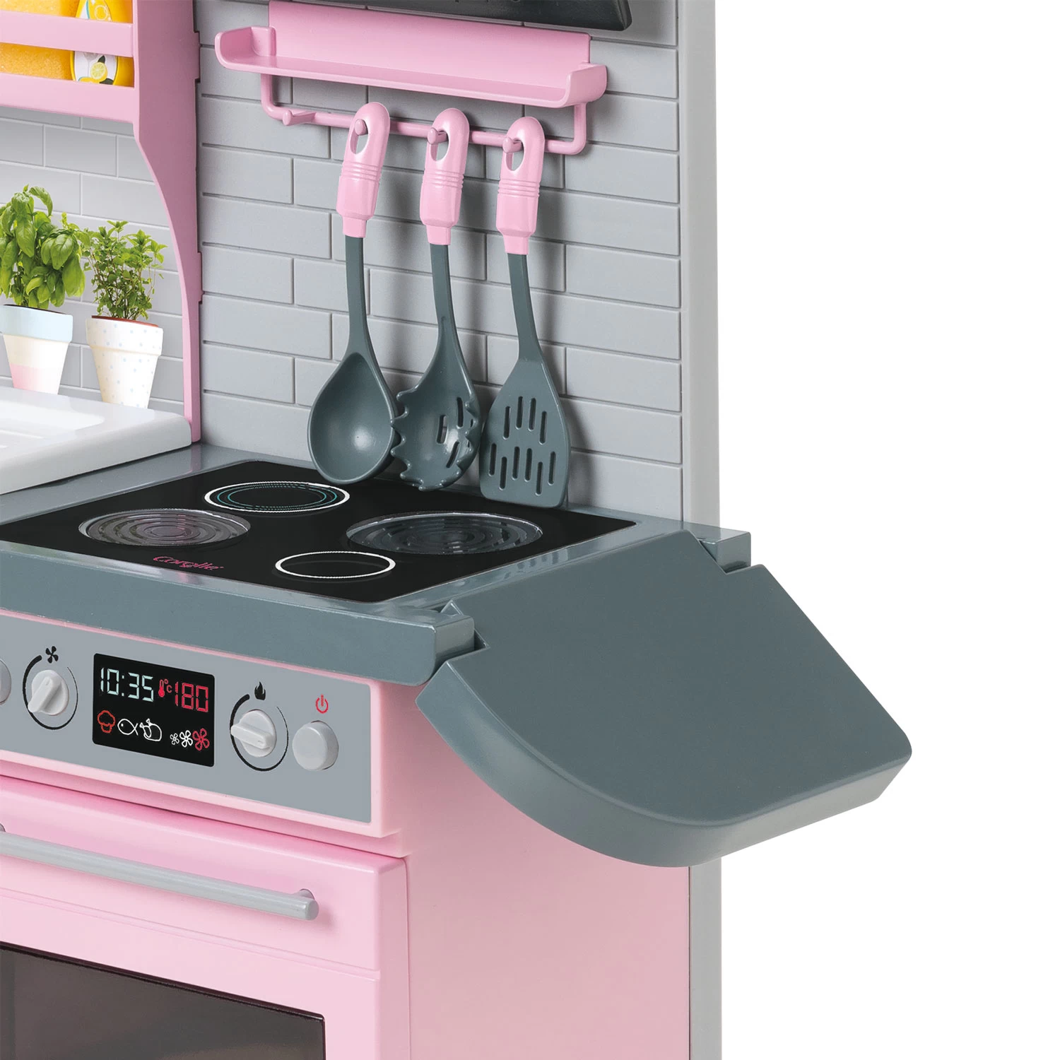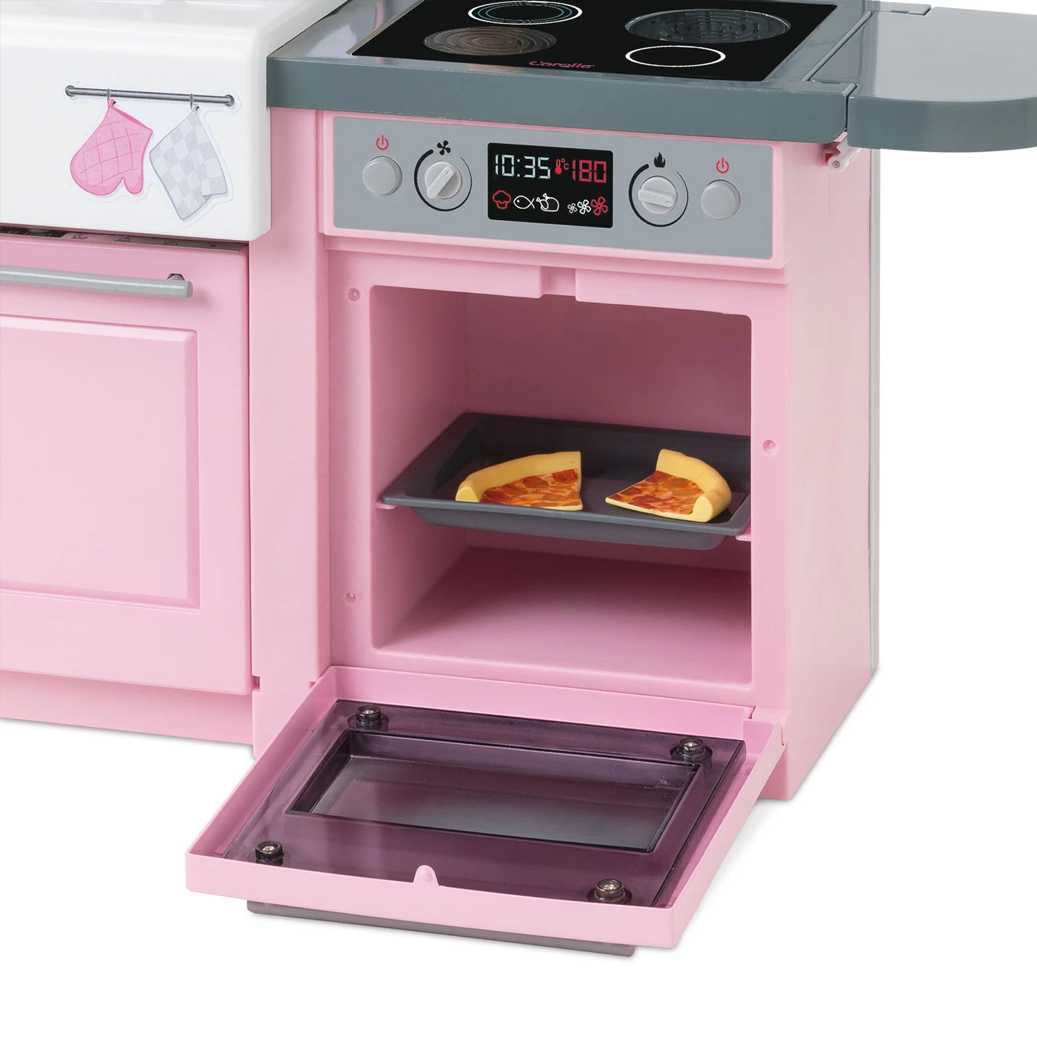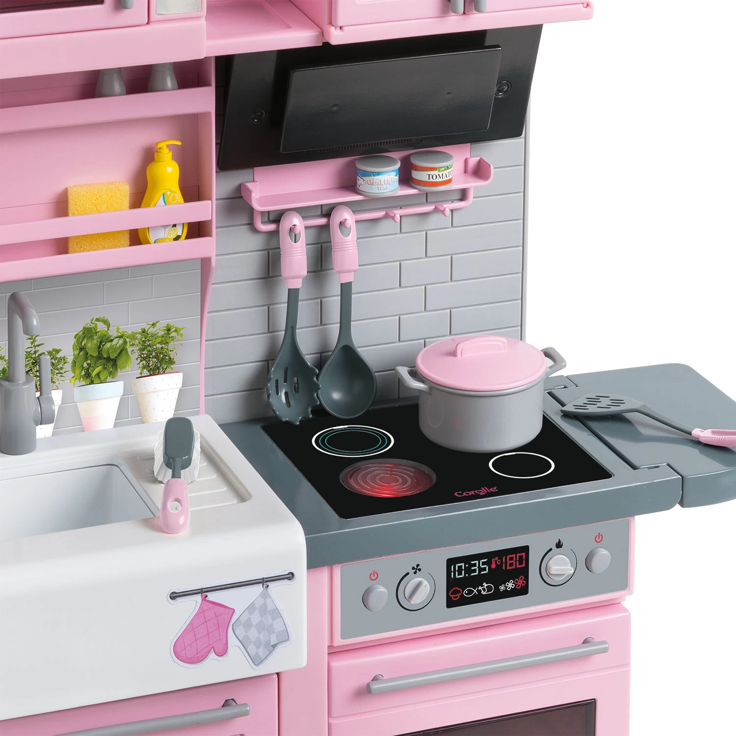 Wow, ab sofort kann Ihr Corolle auch in der eigenen Küche, inklusive Kühlschrank, köstliche Gerichte zubereiten! Das Kochfeld funktioniert, der Backofen macht Geräusche und auch der Kühlschrank erzeugt Licht und Ton. Die Küche ist mit vielen Accessoires wie Pfannen, Essgeschirr, Getränken und Lebensmitteln ausgestattet. Genießen Sie das Kochen mit Ihrer Puppe und bevor Sie es merken, stehen die leckersten Gerichte auf dem Tisch. Betrieb mit 6 Knopfzellenbatterien (Batterien sind im Lieferumfang enthalten). Geeignet für Corolle Puppen von 36 Zentimetern.