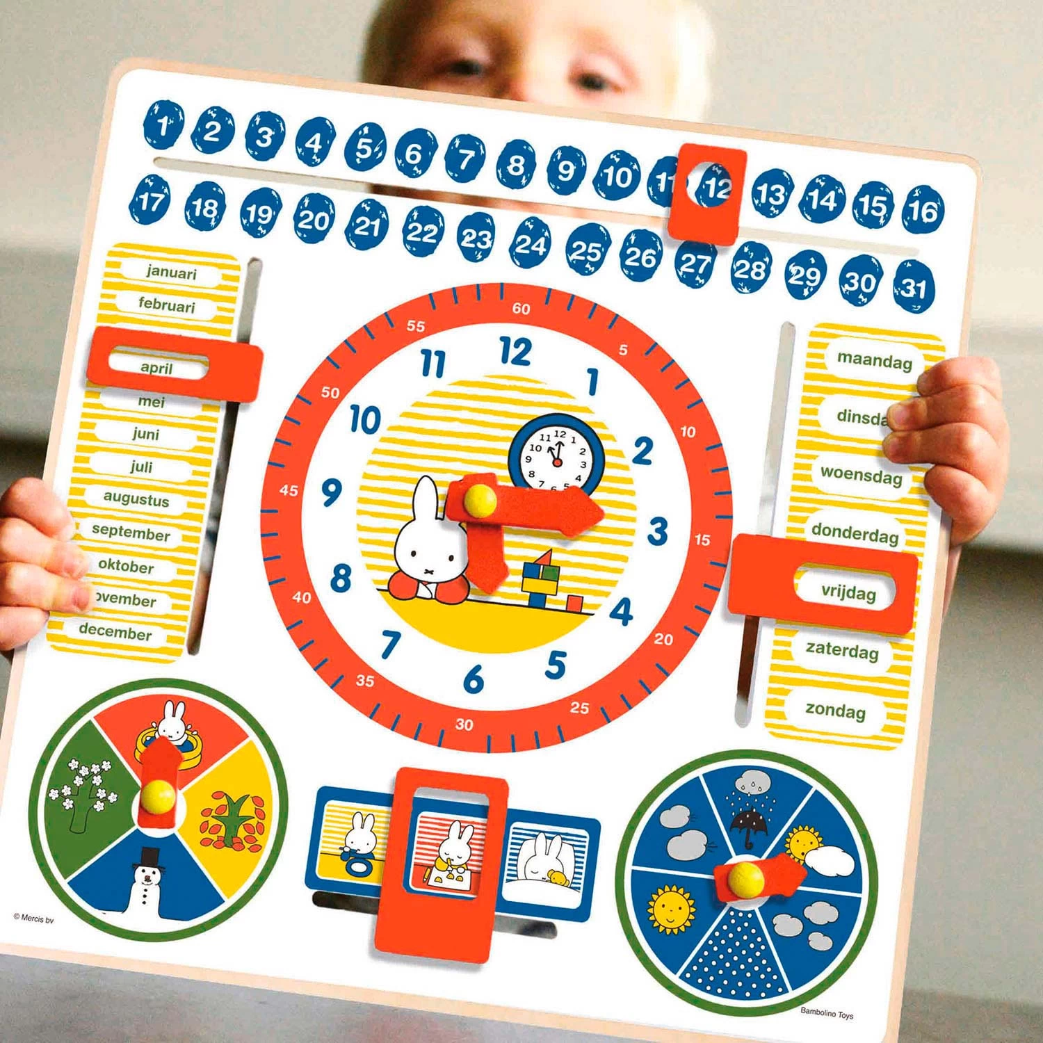 Die Miffy -Kalenderuhr ist sehr lehrreich und kann Kindern, die sie brauchen, viel Struktur bieten. Mithilfe verschiedener Holzschieber und rotierender Zeiger können Kinder lernen, die Uhrzeit abzulesen und zu sehen, was zu welcher Zeit geplant ist. Sie lernen auch die Jahreszeiten, Wochentage und Monate kennen. Sogar der Tag des Monats und das Wetter können eingestellt werden. Der Kalender verfügt über zwei Löcher auf der Rückseite zur Befestigung an der Wand, kann aber auch problemlos flach auf dem Tisch verwendet werden.