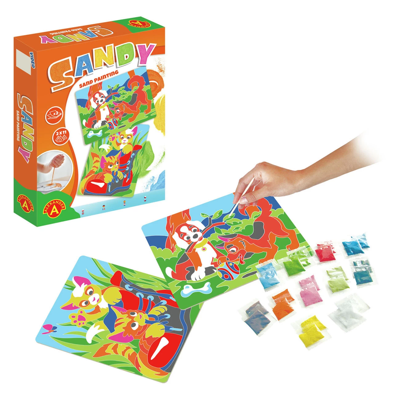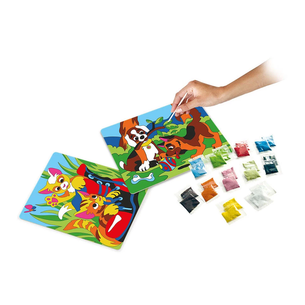 Mit Sand lassen sich die schönsten Kunstwerke erschaffen. Diese können Sie nicht nur im Sommer am Strand, sondern auch zu Hause am Basteltisch herstellen. Indem die ausgeschnittenen Elemente einzeln freigelegt werden, entstehen klebrige Oberflächen, die jeweils mit Sand in verschiedenen Farben bestreut werden können, um ein wunderschönes Sandgemälde zu schaffen. Neben dem großen Spaß, den die Kinder beim Basteln ihrer Sandkunstwerke haben, fördern Sie auch verschiedene Fähigkeiten wie Geschicklichkeit und Hand-Auge-Koordination. Inhalt • 2 Bilder • 2 x 11 Beutel mit farbigem Sand • Holzstab • Papierblock • Anleitung
