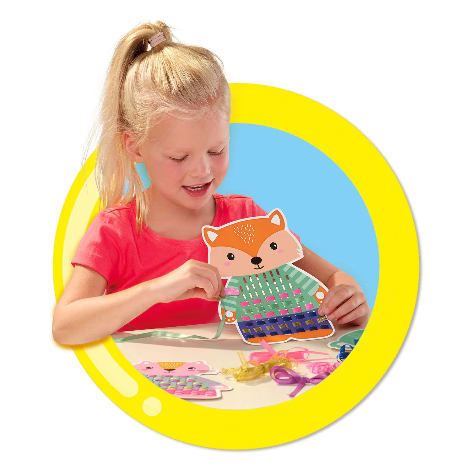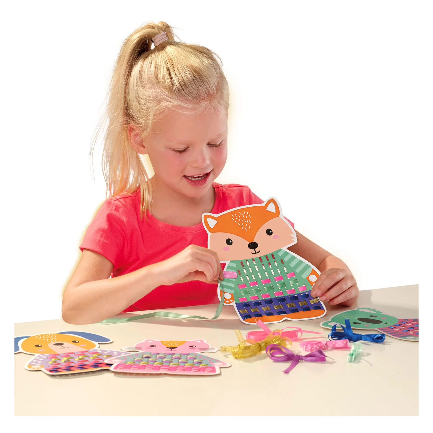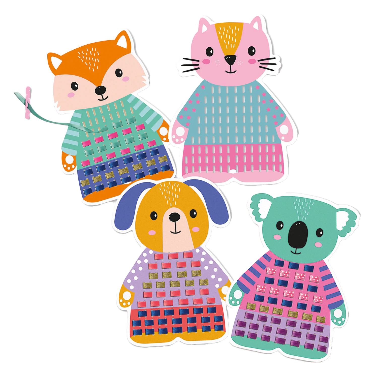 Diese fröhlichen Tiere sind noch nicht ganz fertig, ihr Outfit ist noch nicht ganz fertig! Und Sie können dabei helfen. Mit den Bändern in 6 Farben können Sie Koala, Fuchs, Hund und Katze komplett stylen. Wählen Sie eine schöne Farbe und weben Sie ihre Kleidung vollständig. Das Kombinieren ist ganz einfach und mit den Papierwebnadeln lernt man das Weben wie ein echter Profi.