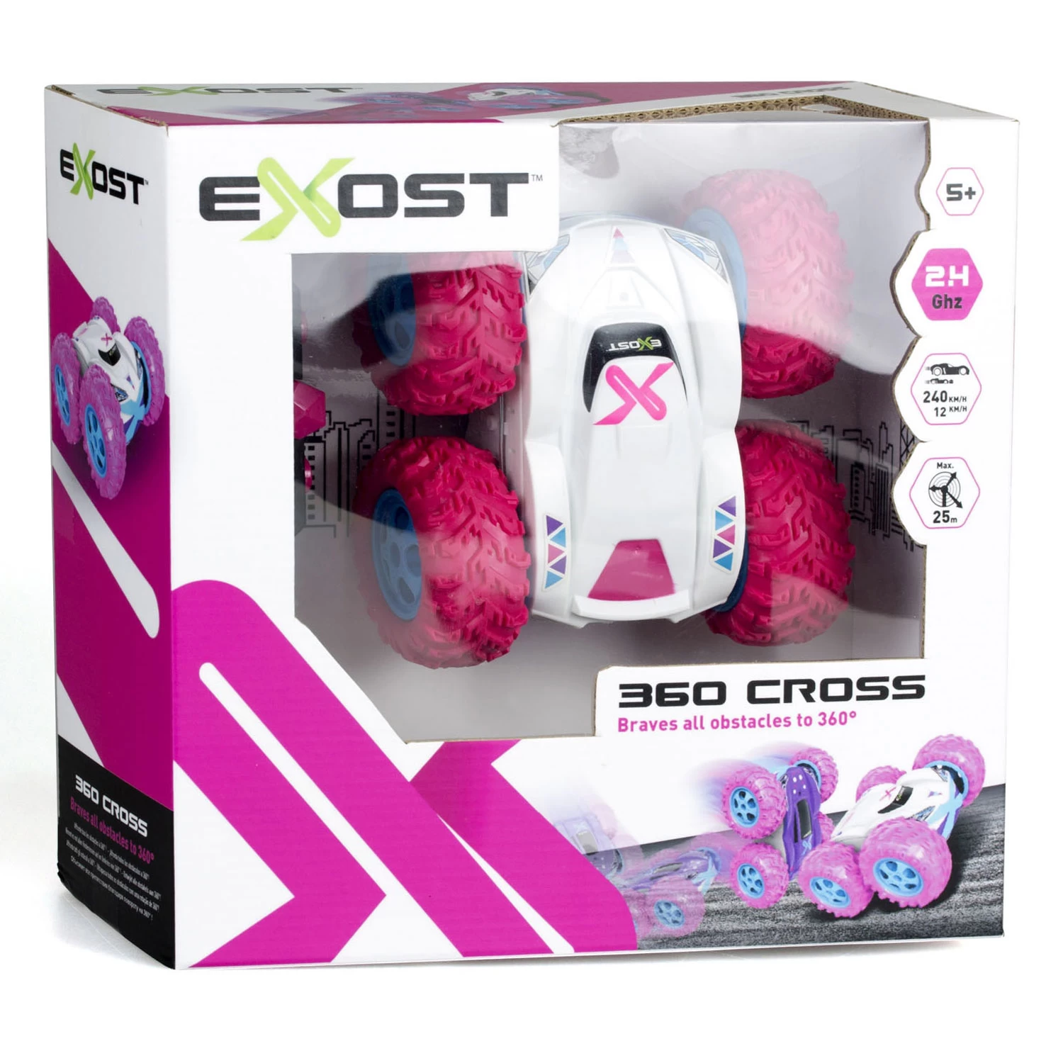 Der neue Exost RC 360 Cross Amazone mit seinen rosa Reifen kann sich um 360 Grad drehen, einen Flip machen und auf beiden Seiten fahren. Steuern Sie dieses Stuntauto ganz einfach mit dem Controller. Die großen, extrem langlebigen Reifen bewältigen alle Oberflächen problemlos! Der RC 360 Cross verfügt über zwei verschiedene Karosseriedesigns. Geschwindigkeit: 12 km/h. Maßstab: 1:18. Reichweite: 25 Meter. Verpackungsmaße: 28x10x26 cm (LxBxH). Batterieinformationen: Auto 4 x AA (nicht im Lieferumfang enthalten) – Controller: 2 x AAA-Batterien (nicht im Lieferumfang enthalten). Altersangabe: 5+