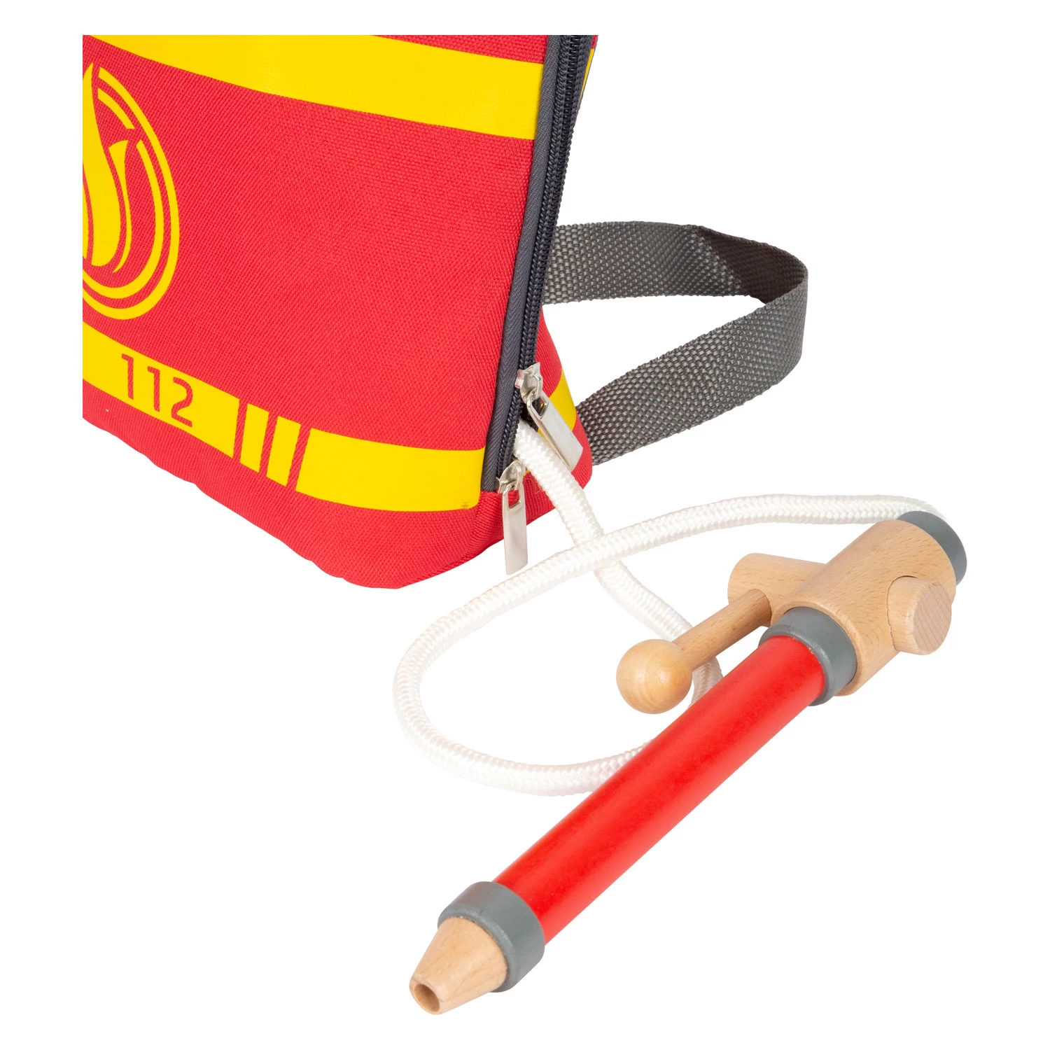 Dieser praktische Feuerwehrrucksack mit kompletter Feuerwehrausrüstung und allen wichtigen Werkzeugen ermöglicht Kindern das Nachspielen eines spannenden Feuerwehreinsatzes. Und es ist ideal für unterwegs! Dieses Komplettset beinhaltet eine Spielzeugaxt aus Holz, ein Brecheisen aus Holz und einen Wassersprüher mit Griff und Seil. Die Schlauch-/Seilteile können am Rucksack befestigt werden, wodurch der Rucksack in einen tragbaren Wassertank verwandelt wird! Abgerundet wird das Spielset durch einen verstellbaren Kunststoffhelm, ein Spielzeugradio, ein Megafon und ein klappbares Gefahrenschild mit Kreidetafel, damit die Kinder über das Geschehene informieren können.
