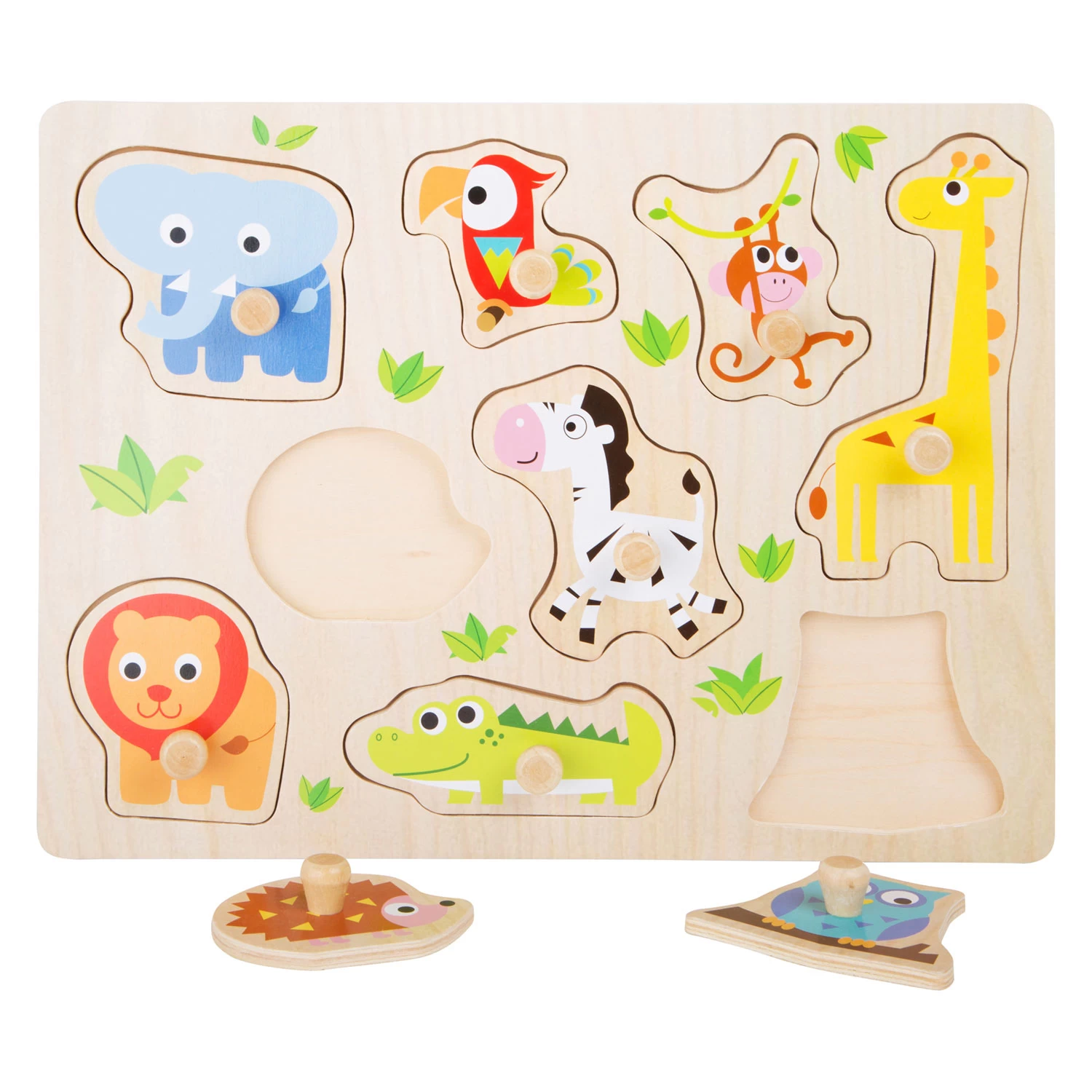 Geh in den Zoo! Die Holzpuzzleteile verfügen über einen Knopf zum einfachen Greifen und Einsetzen. Hier werden die Feinmotorik des Kleinkindes gefördert und Geduld geschult. Die bunten Zootiere zieren dieses schöne Holzpuzzle. Ein Affe schaukelt auf einer Liane und der Uhu sitzt gemütlich auf seinem Ast. Der Löwe schaut sich freundlich um und die Giraffe versucht, ein paar Blätter zu fangen.