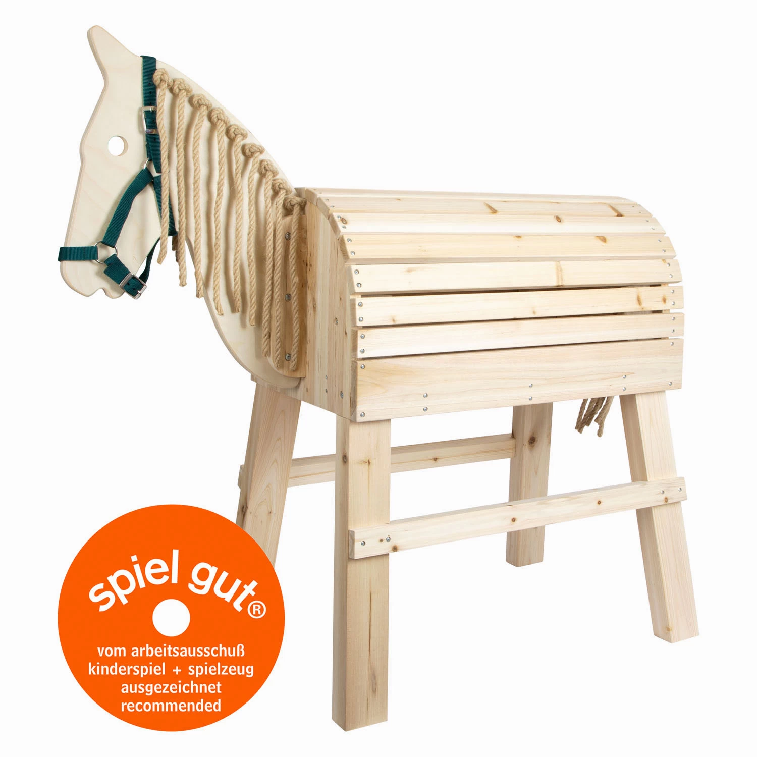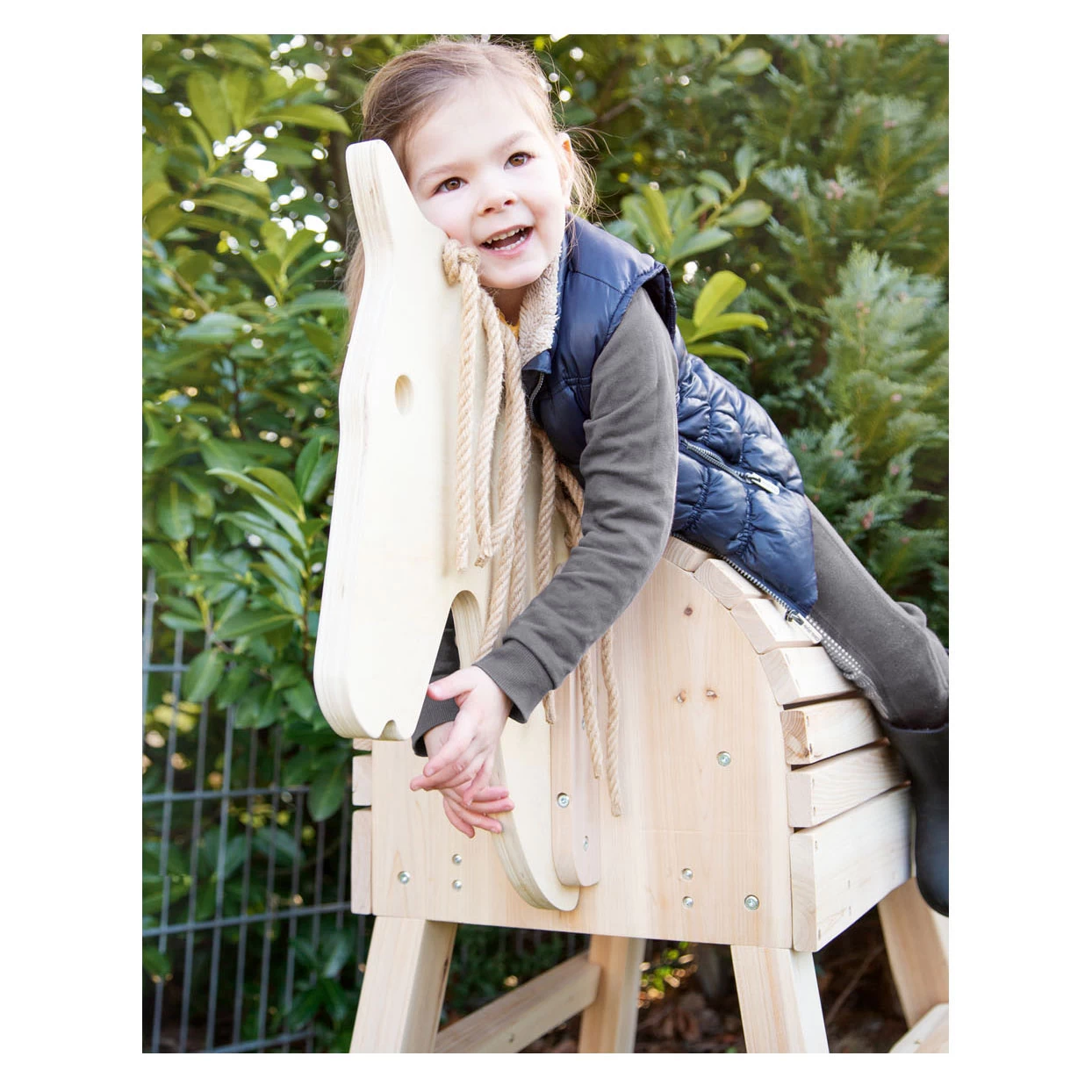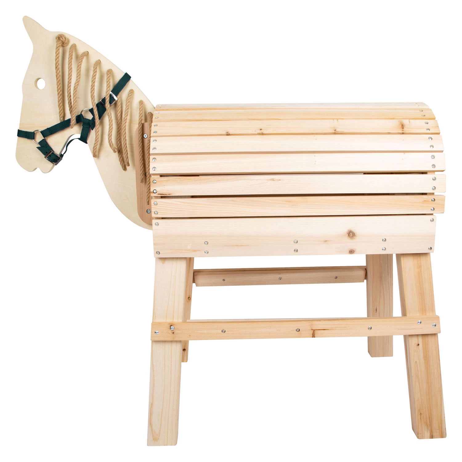 Ein Holzpferd ist das beste Geschenk für alle Pferdeliebhaber! Mit diesem großen Spiel-, Reit- und Springpferd aus unbehandeltem, witterungsbeständigem Holz können sowohl kleine als auch größere Reiter spielerisch die Grundlagen des Pferde-, Pony- und Reitsports erlernen. Die Mähne und der Schweif aus Sisal laden Kinder zum Stylen und Flechten ein, und eine Stufe erleichtert kleinen Kindern den Aufstieg auf das Pferd. Die ausgestellten Beine sorgen für einen stabilen, sicheren Stand. Und das Besondere: Hinter der Klapptür auf der Rückseite befindet sich im Bauch des Pferdes ein großer Stauraum, in dem Halfter, Putzutensilien und Zubehör untergebracht werden können. Kommt mit einem Halfter! Ideal für den Garten oder das Kinderzimmer. Die Größe des Pferderückens wurde so konzipiert, dass er zu einem echten Sattel und einer Unterlage passt. Für eine dauerhafte Nutzung kann das unbehandelte Holz je nach Bedarf und Wunsch des Anwenders mit einem Holzschutzlack behandelt werden.